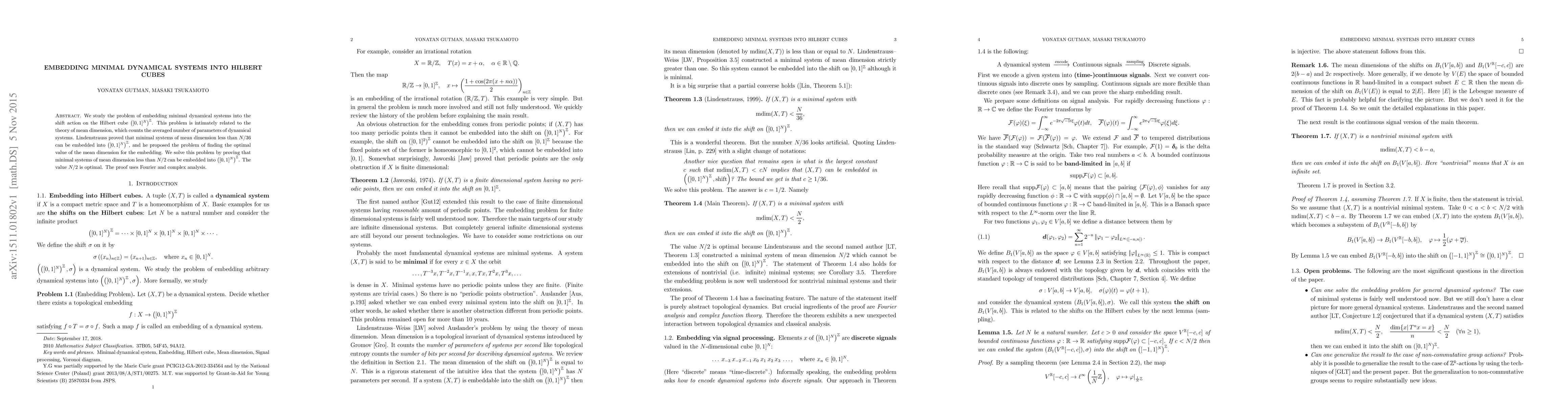 We study the problem of embedding minimal dynamical systems into the shift action on the Hilbert cube $\left([0,1]^N\right)^{\mathbb{Z}}$. This problem is intimately related to the theory of mean dimension, which counts the averaged number of parameters of dynamical systems. Lindenstrauss proved that minimal systems of mean dimension less than $N/36$ can be embedded into $\left([0,1]^N\right)^{\mathbb{Z}}$, and he proposed the problem of finding the optimal value of the mean dimension for the embedding. We solve this problem by proving that minimal systems of mean dimension less than $N/2$ can be embedded into $\left([0,1]^N\right)^{\mathbb{Z}}$. The value $N/2$ is optimal. The proof uses Fourier and complex analysis.
