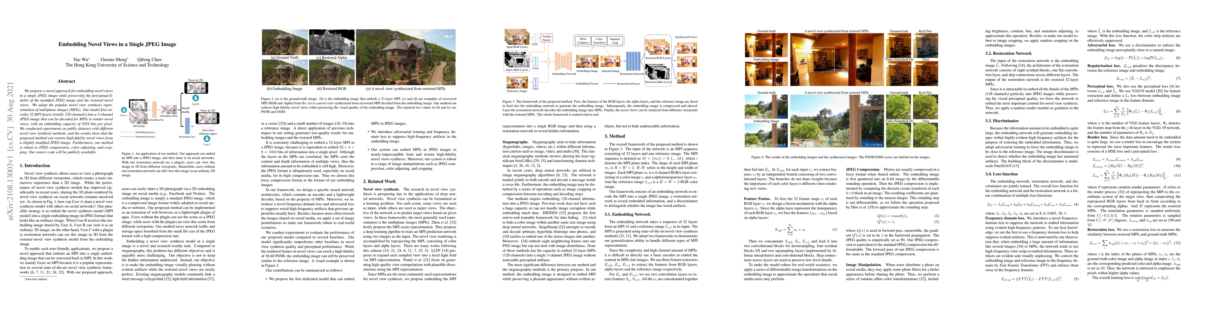 This paper introduces a method to embed novel views into a single JPEG image using multiplane images (MPIs), preserving perceptual fidelity. The approach encodes 32 MPI layers into a 3-channel JPEG, enabling high-fidelity novel view synthesis and demonstrating robustness to JPEG compression, color adjustments, and cropping.
