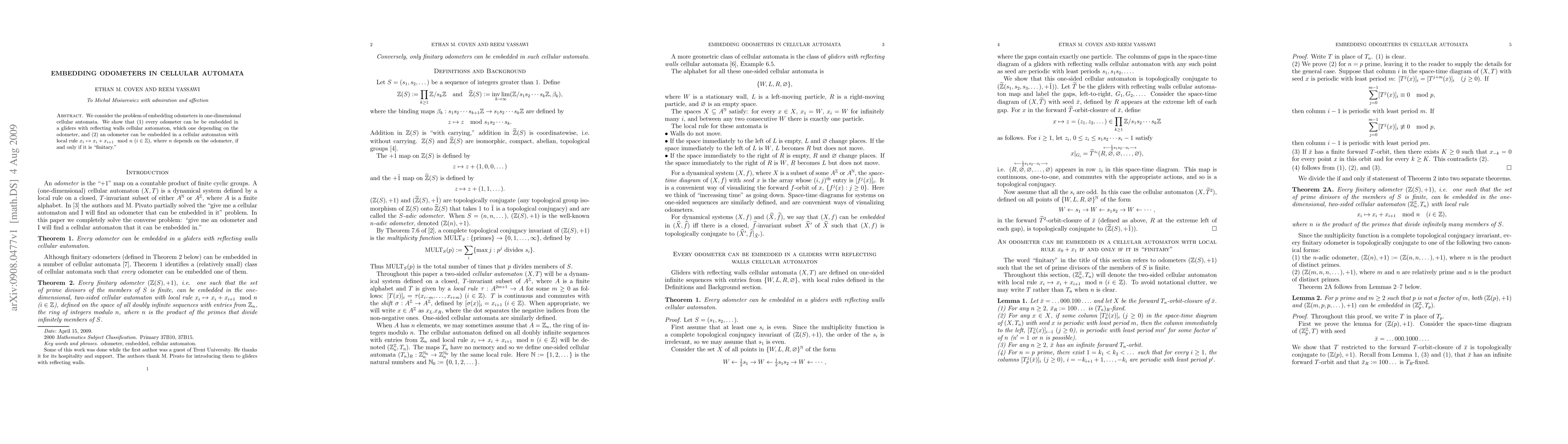 We consider the problem of embedding odometers in one-dimensional cellular automata. We show that (1) every odometer can be be embedded in a gliders with reflecting walls cellular automaton, which one depending on the odometer, and (2) an odometer can be embedded in a cellular automaton, which is a group endomorphism on an n-letter group, and where n depends on the odometer, if and only if the odometer is "finitary."
