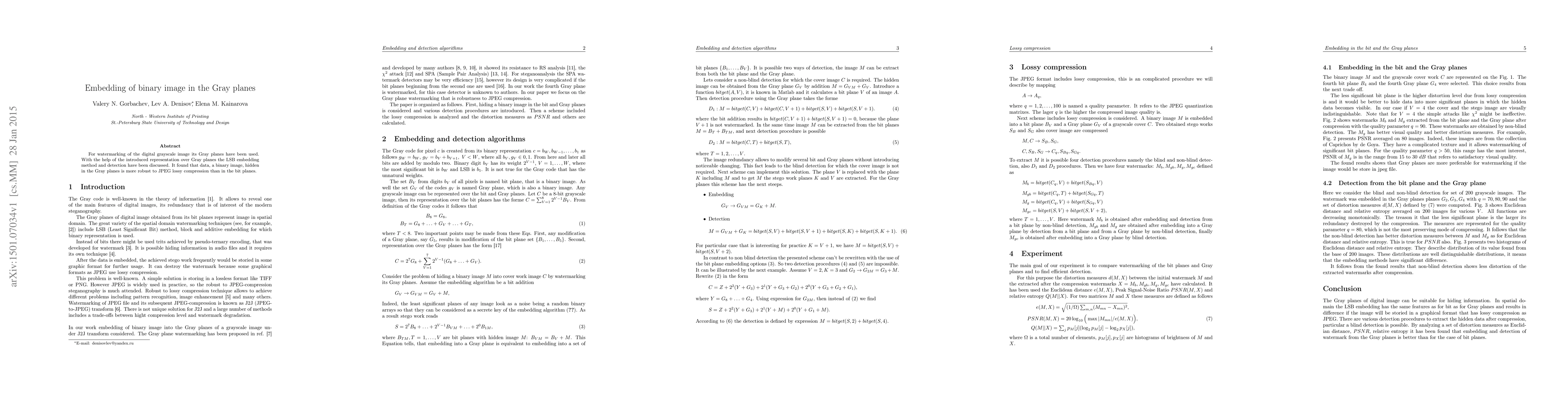 The paper explores watermarking digital grayscale images using Gray planes, presenting an LSB embedding method. The study concludes that embedding binary data in Gray planes enhances robustness against JPEG lossy compression compared to bit planes.