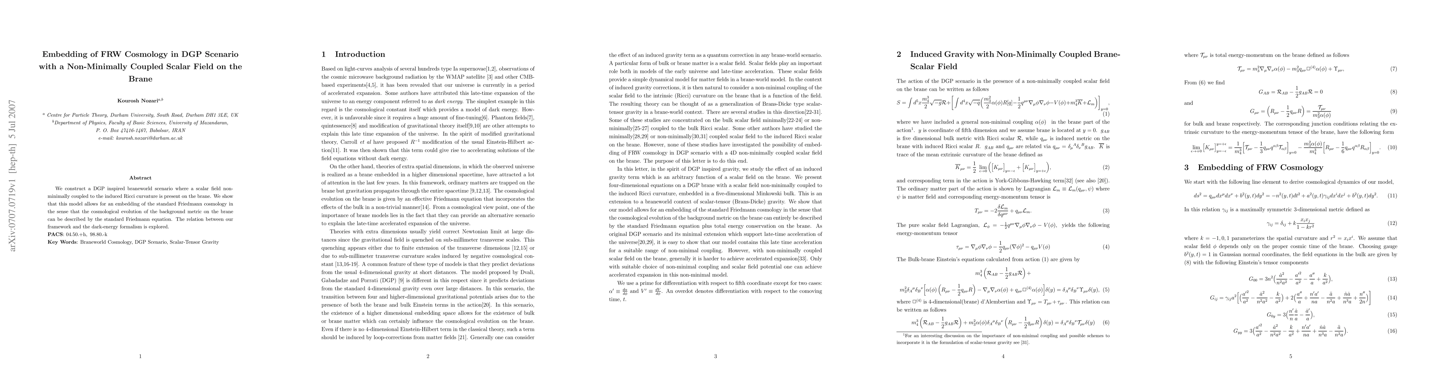 We construct a DGP inspired braneworld scenario where a scalar field non-minimally coupled to the induced Ricci curvature is present on the brane. We show that this model allows for an embedding of the standard Friedmann cosmology in the sense that the cosmological evolution of the background metric on the brane can be described by the standard Friedmann equation. The relation between our framework and the dark-energy formalism is explored.