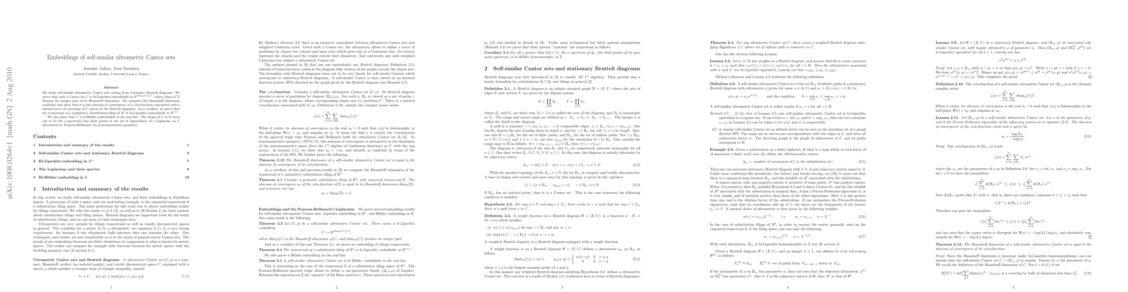 We study self-similar ultrametric Cantor sets arising from stationary Bratteli diagrams. We prove that such a Cantor set C is bi-Lipschitz embeddable in R^(d+1), where d denotes the integer part of its Hausdorff dimension. We compute this Hausdorff dimension explicitly and show that it is the abscissa of convergence of a zeta-function associated with a natural nerve of coverings of C (given by the Bratteli diagram). As a corollary we prove that the transversal of a (primitive) substitution tiling of R^d is bi-Lipschitz embeddable in R^(d+1) . We also show that C is bi-Hoelder embeddable in the real line. The image of C in R turns out to be the omega-spectrum (the limit points of the set of eigenvalues) of a Laplacian on C introduced by Pearson-Bellissard via noncommutative geometry.