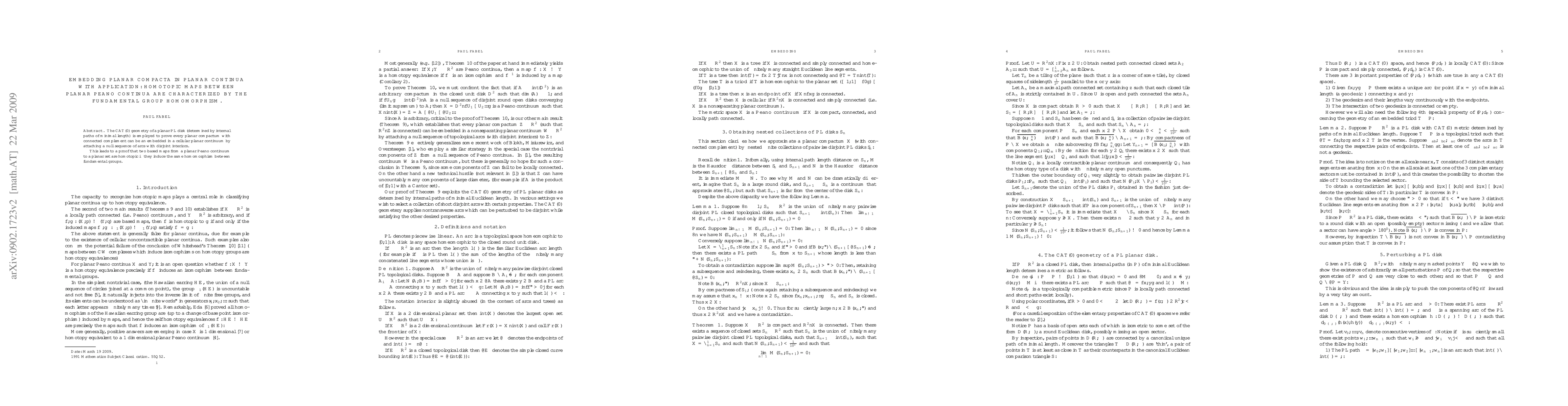 A planar compactum with connected complement can be an embedded in a cellular continuum by attaching a null sequence of arcs. Two based maps f and g from a planar Peano continuum X to a planar set Y are homotopic iff f and g induce the same homomorphism between fundamental groups.