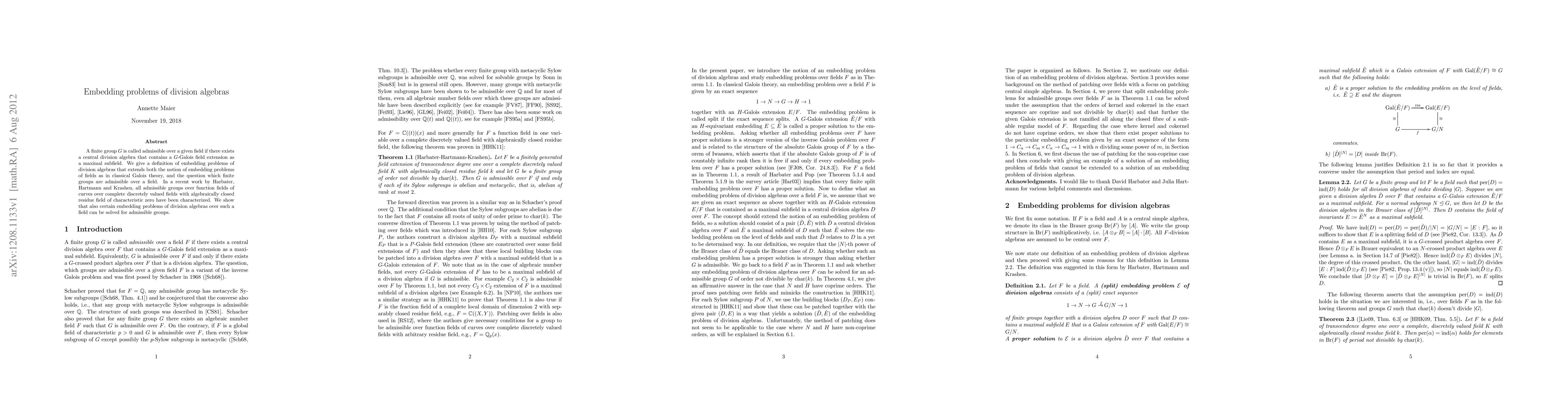 This paper defines embedding problems for central division algebras that extend classical Galois theory concepts and explores which finite groups are admissible over a given field. It demonstrates that certain division algebra embedding problems can be solved for admissible groups over function fields of curves over complete discretely valued fields.