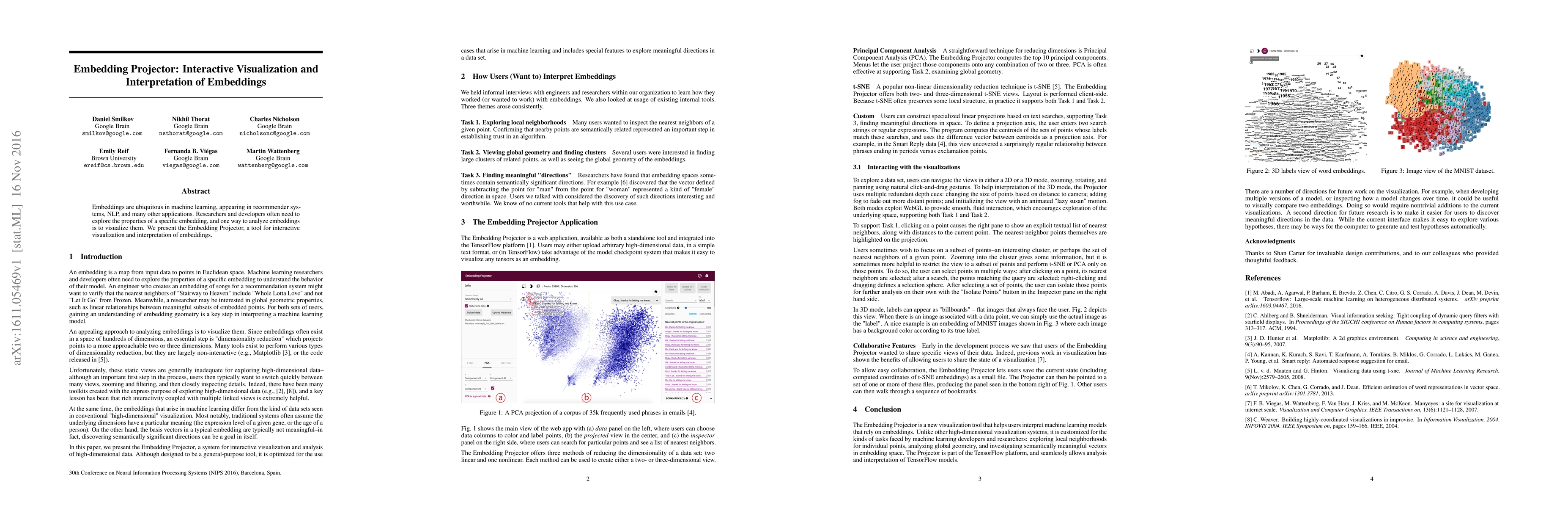 Embeddings are ubiquitous in machine learning, appearing in recommender systems, NLP, and many other applications. Researchers and developers often need to explore the properties of a specific embedding, and one way to analyze embeddings is to visualize them. We present the Embedding Projector, a tool for interactive visualization and interpretation of embeddings.