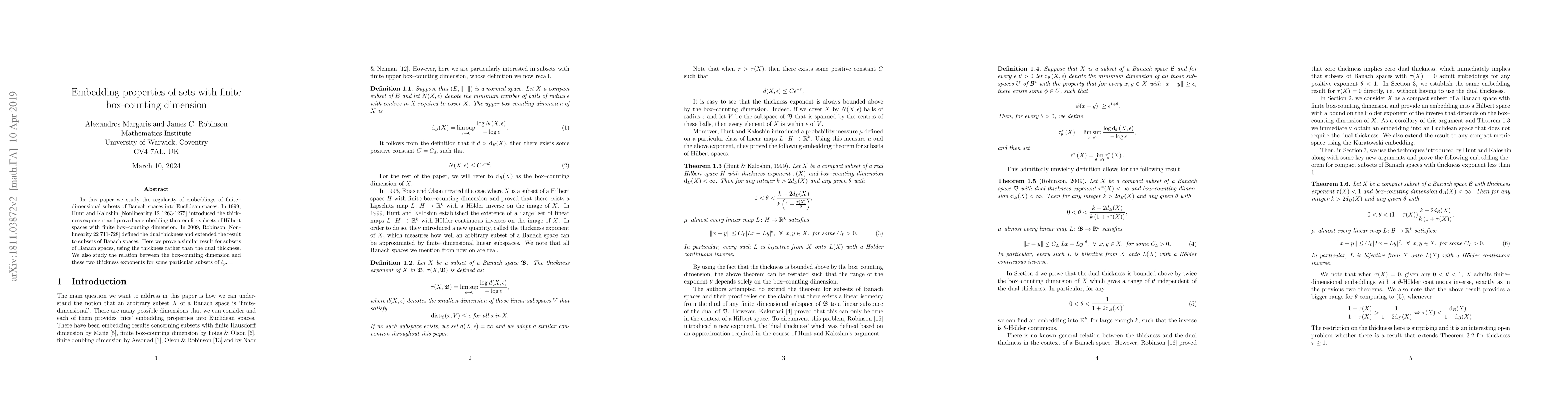 In this paper we study the regularity of embeddings of finite--dimensional subsets of Banach spaces into Euclidean spaces. In 1999, Hunt and Kaloshin [Nonlinearity 12 1263-1275] introduced the thickness exponent and proved an embedding theorem for subsets of Hilbert spaces with finite box--counting dimension. In 2009, Robinson [Nonlinearity 22 711-728] defined the dual thickness and extended the result to subsets of Banach spaces. Here we prove a similar result for subsets of Banach spaces, using the thickness rather than the dual thickness. We also study the relation between the box-counting dimension and these two thickness exponents for some particular subsets of $\ell_{p}$.