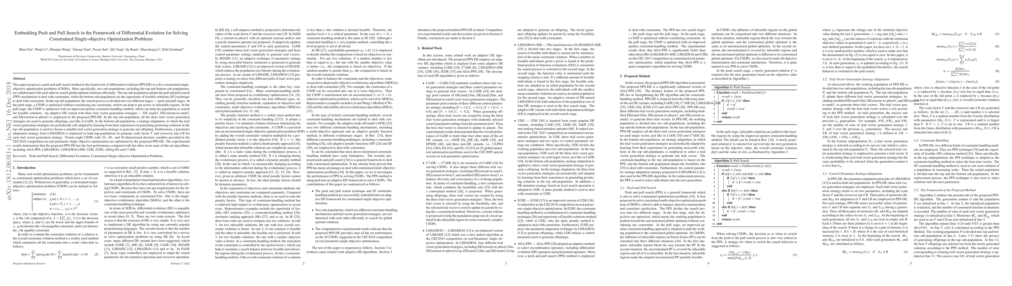 This paper introduces a novel push and pull search method within differential evolution (PPS-DE) to tackle constrained single-objective optimization problems (CSOPs). The method employs two sub-populations that collaborate to efficiently find global optima, demonstrating superior performance over seven state-of-the-art algorithms on 28 CSOPs.