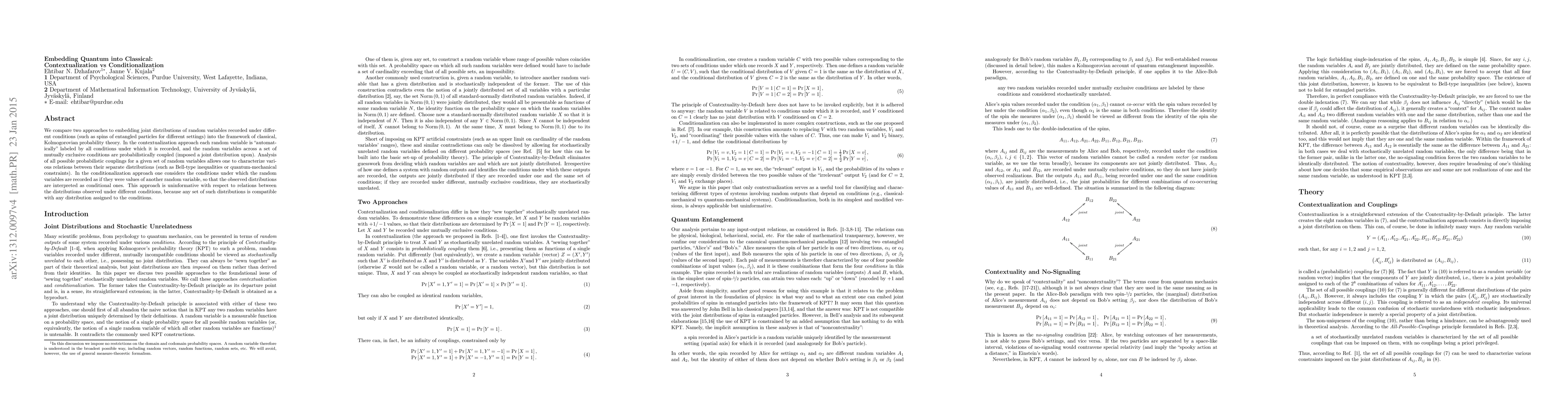 This paper compares two methods for embedding quantum data into classical probability theory: contextualization and conditionalization. Contextualization labels variables by recording conditions and probabilistically couples them, revealing relations like Bell-type inequalities. Conditionalization treats conditions as random variables, yielding uninformative interpretations of observed distributions.