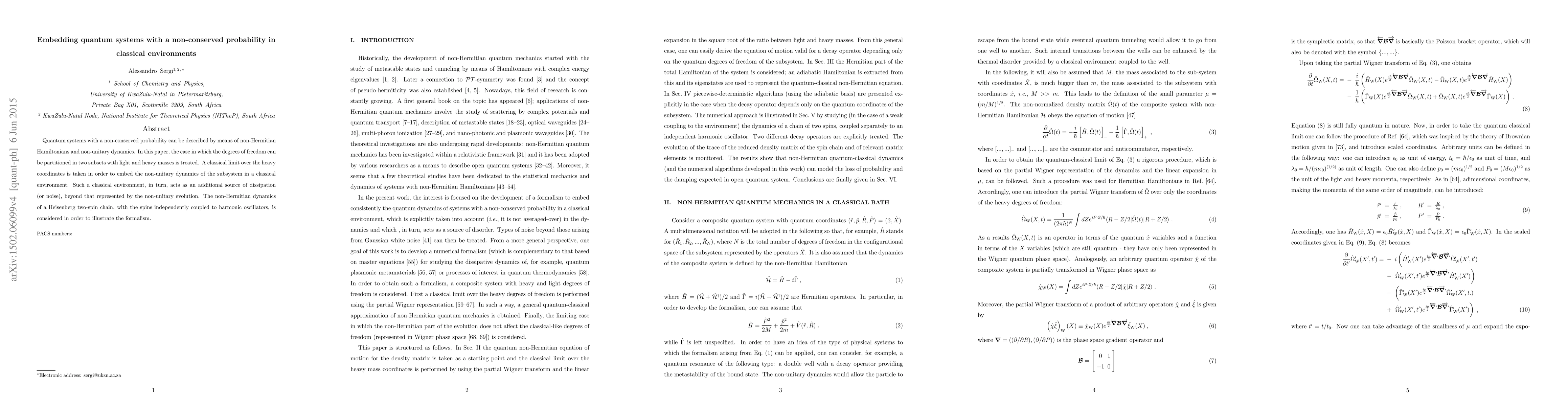 This paper explores embedding quantum systems with non-conserved probability in classical environments using non-Hermitian Hamiltonians. It demonstrates a classical limit over heavy coordinates to embed non-unitary dynamics in a classical environment, which acts as an additional source of dissipation, illustrated through a Heisenberg two-spin chain coupled to harmonic oscillators.