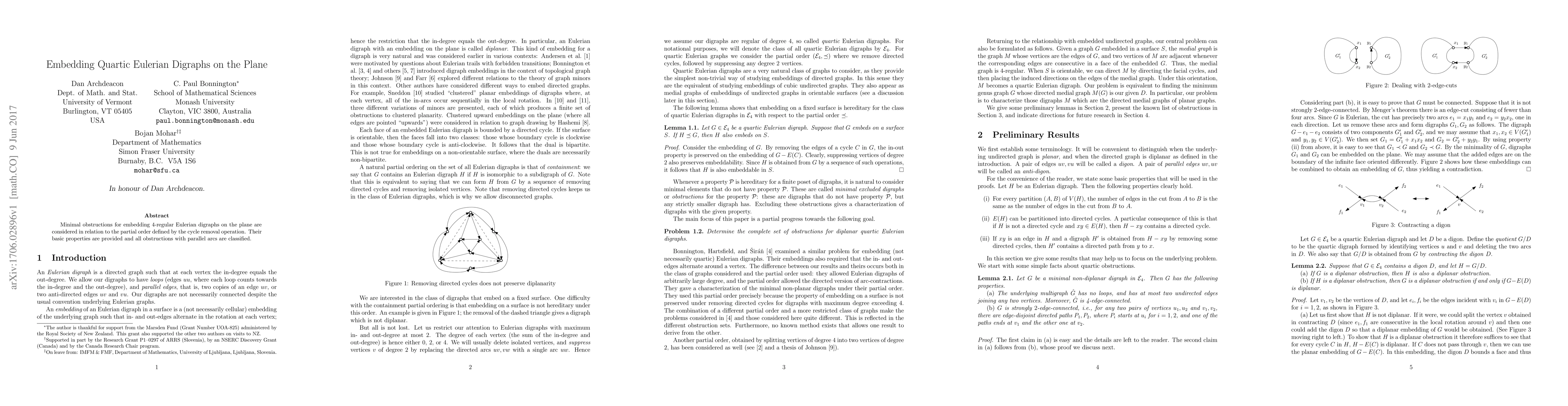 This research paper investigates embedding 4-regular Eulerian digraphs on a plane, focusing on minimal obstructions for embedding with parallel arcs, and classifies these obstructions.
