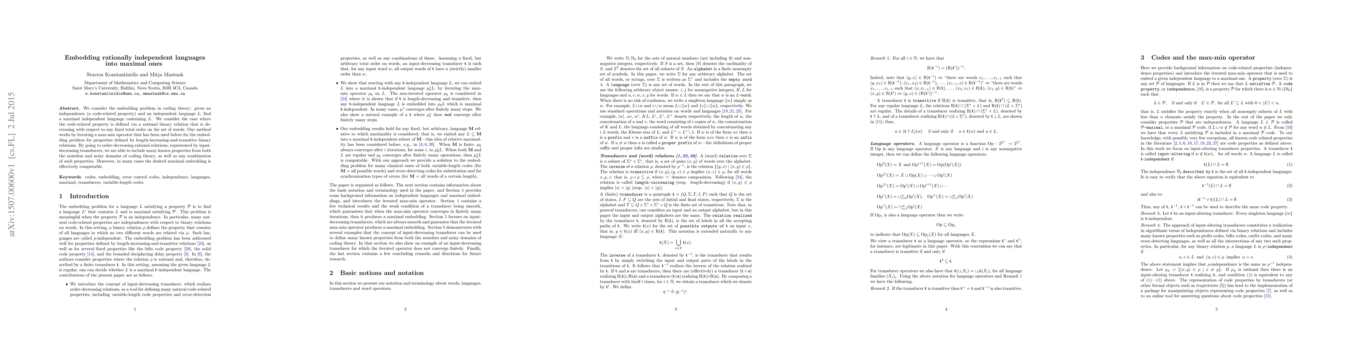 Researchers develop a method to embed rationally independent languages into maximal ones, allowing for the inclusion of various properties from coding theory, including noiseless and noisy domains.