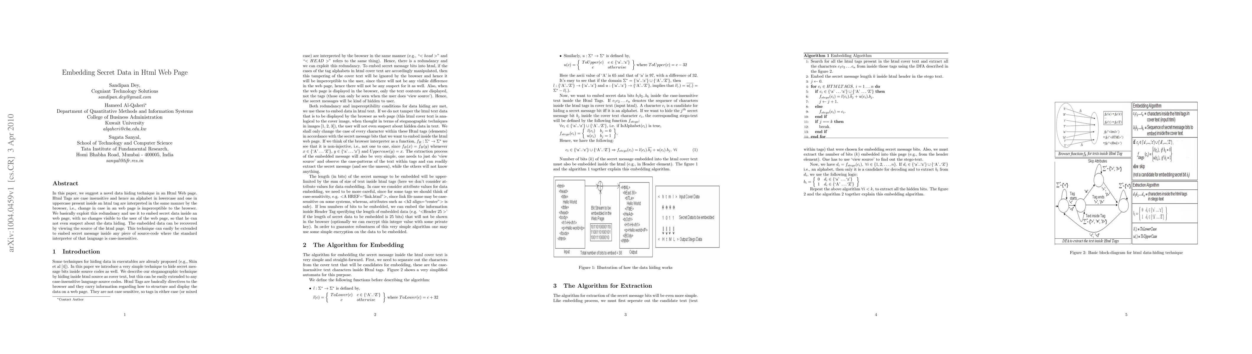 In this paper, we suggest a novel data hiding technique in an HTML Web page. HTML Tags are case insensitive and hence an alphabet in lowercase and one in uppercase present inside an HTML tag are interpreted in the same manner by the browser,i.e., change in case in an web page is imperceptible to the browser. We basically exploit this redundancy and use it to embed secret data inside an web page, with no changes visible to the user of the web page, so that he can not even suspect about the data hiding. The embedded data can be recovered by viewing the source of the HTML page. This technique can easily be extended to embed secret message inside any piece of source-code where the standard interpreter of that language is case-insensitive.