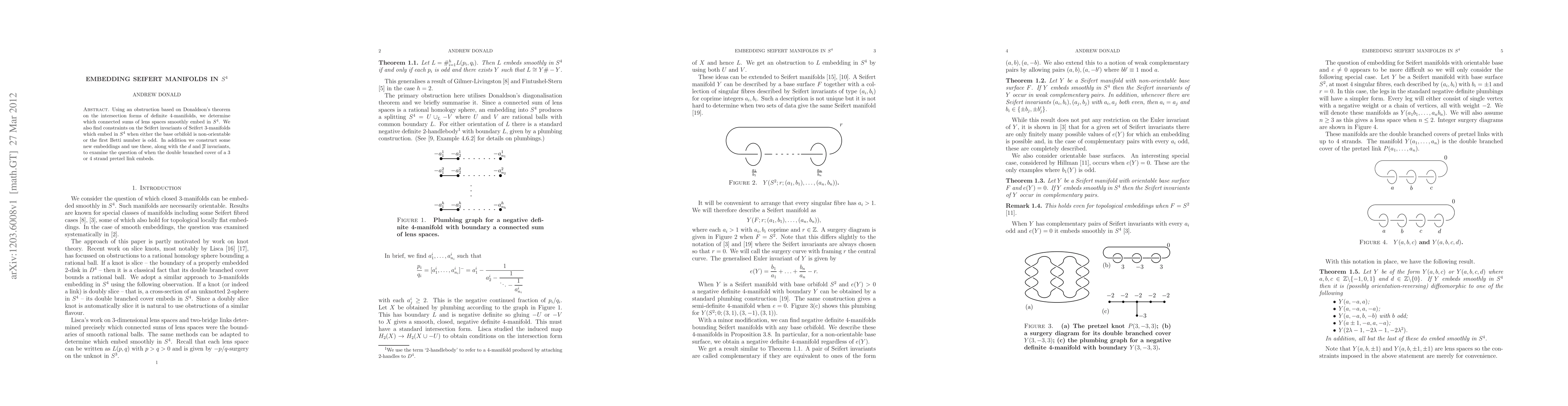 This paper determines conditions for the smooth embedding of connected sums of lens spaces in S^4 using Donaldson's theorem and finds constraints on Seifert invariants for Seifert 3-manifolds embedding in S^4. It also explores embeddings of double branched covers of pretzel links.