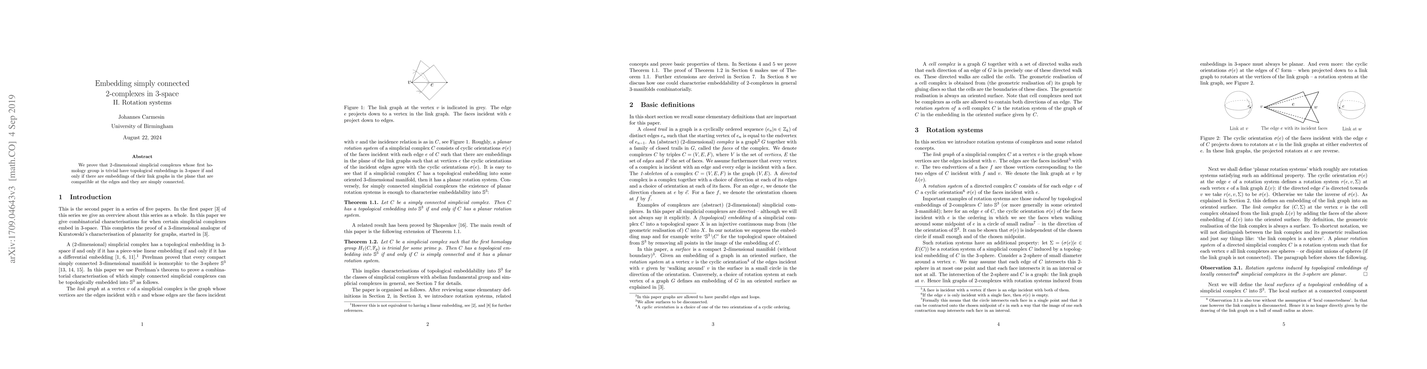 We prove that 2-dimensional simplicial complexes whose first homology group is trivial have topological embeddings in 3-space if and only if there are embeddings of their link graphs in the plane that are compatible at the edges and they are simply connected.