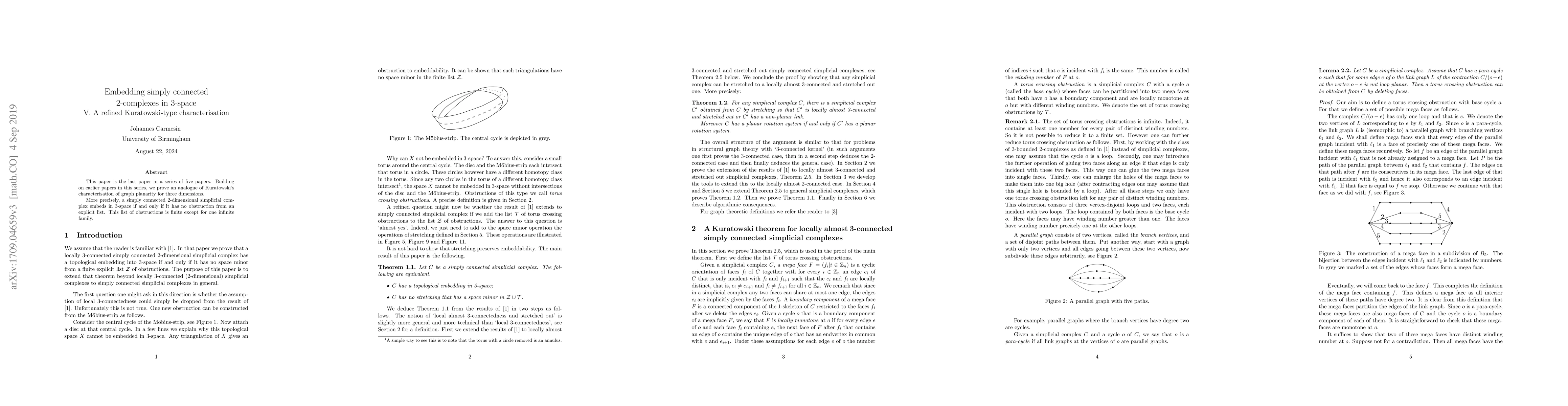 This paper is the last paper in a series of five papers. Building on earlier papers in this series, we prove an analogue of Kuratowski's characterisation of graph planarity for three dimensions. More precisely, a simply connected 2-dimensional simplicial complex embeds in 3-space if and only if it has no obstruction from an explicit list of obstructions. This list of obstructions is finite except for one infinite family.