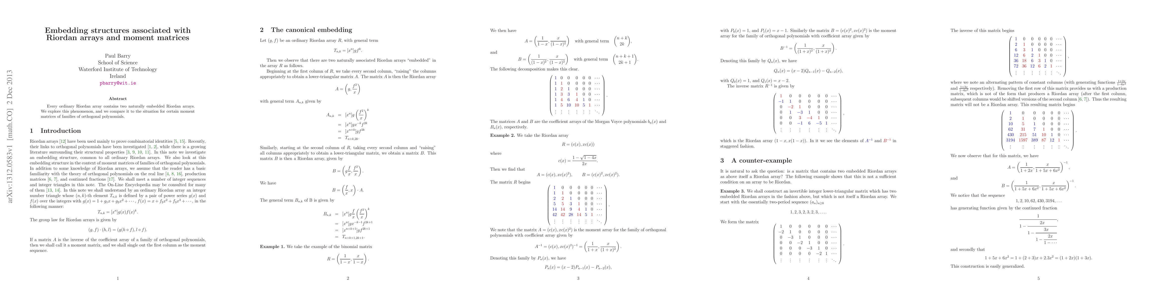 Summary: This paper investigates the inherent structures within ordinary Riordan arrays, specifically focusing on the two embedded Riordan arrays they contain, and draws parallels with the moment matrices of orthogonal polynomial families.