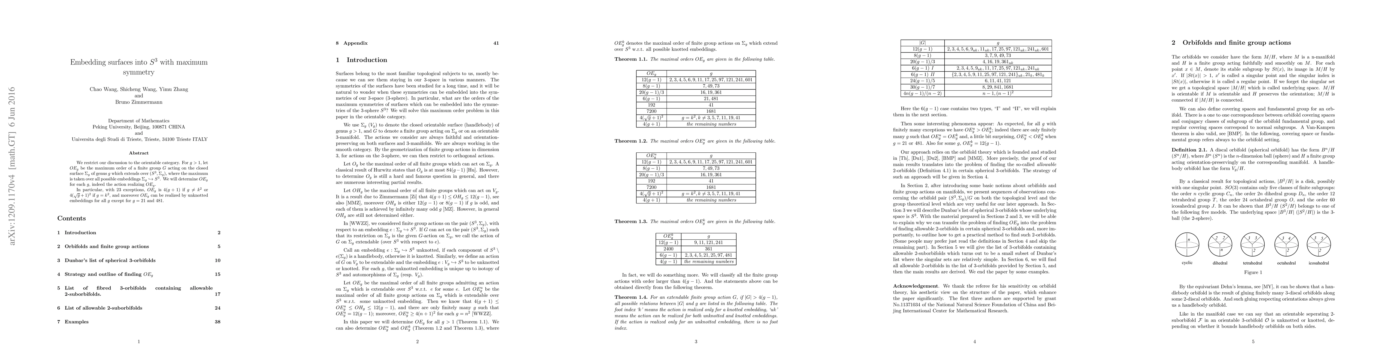 The research methodology involves analyzing orientable surface embeddings into $S^3$ with maximum symmetry, determining the maximum order of a finite group $G$ acting on the closed surface $\Sigma_g$ of genus $g$ which extends over $(S^3, \Sigma_g)$, and identifying the action realizing this maximum order.
