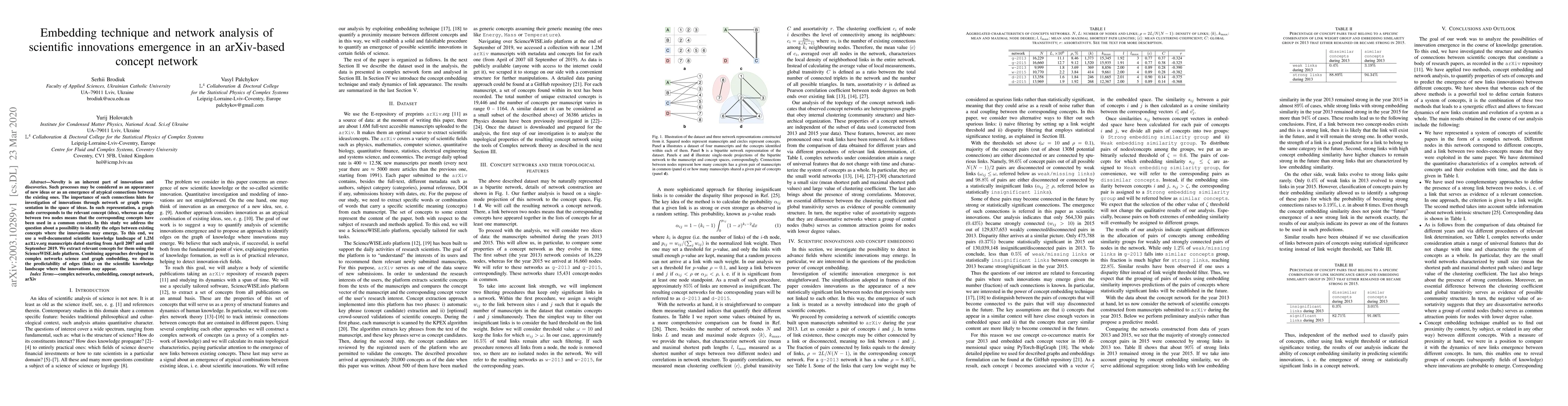 Novelty is an inherent part of innovations and discoveries. Such processes may be considered as an appearance of new ideas or as an emergence of atypical connections between the existing ones. The importance of such connections hints for investigation of innovations through network or graph representation in the space of ideas. In such representation, a graph node corresponds to the relevant concept (idea), whereas an edge between two nodes means that the corresponding concepts have been used in a common context. In this study we address the question about a possibility to identify the edges between existing concepts where the innovations may emerge. To this end, we use a well-documented scientific knowledge landscape of 1.2M arXiv.org manuscripts dated starting from April 2007 and until September 2019. We extract relevant concepts for them using the ScienceWISE.info platform. Combining approaches developed in complex networks science and graph embedding, we discuss the predictability of edges (links) on the scientific knowledge landscape where the innovations may appear.