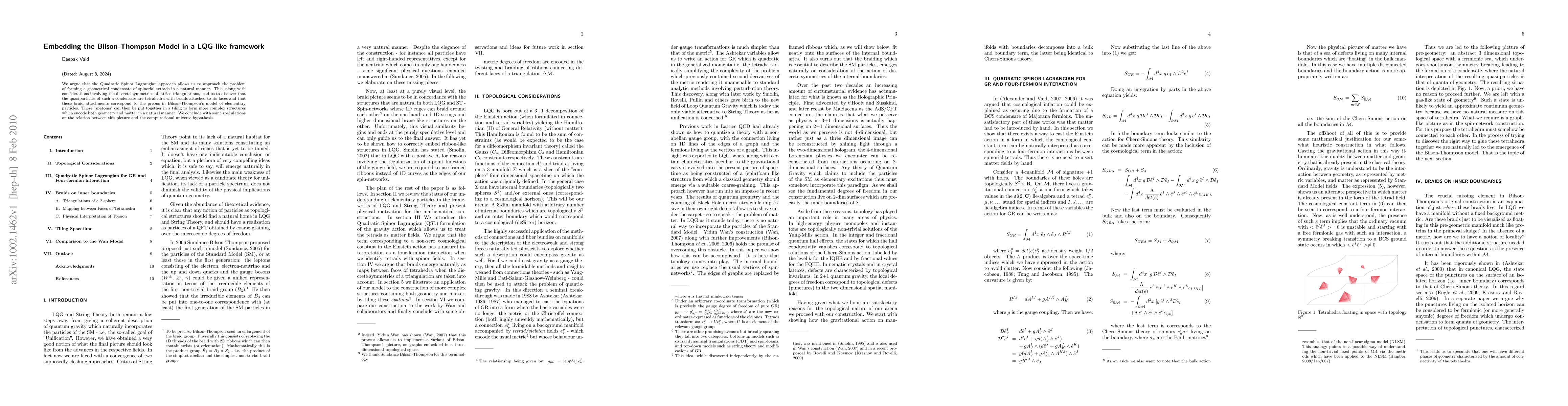 We argue that the Quadratic Spinor Lagrangian approach allows us to approach the problem of forming a geometrical condensate of spinorial tetrads in a natural manner. This, along with considerations involving the discrete symmetries of lattice triangulations, lead us to discover that the quasiparticles of such a condensate are tetrahedra with braids attached to its faces and that these braid attachments correspond to the preons in Bilson-Thompson's model of elementary particles. These "spatoms" can then be put together in a tiling to form more complex structures which encode both geometry and matter in a natural manner. We conclude with some speculations on the relation between this picture and the computational universe hypothesis.