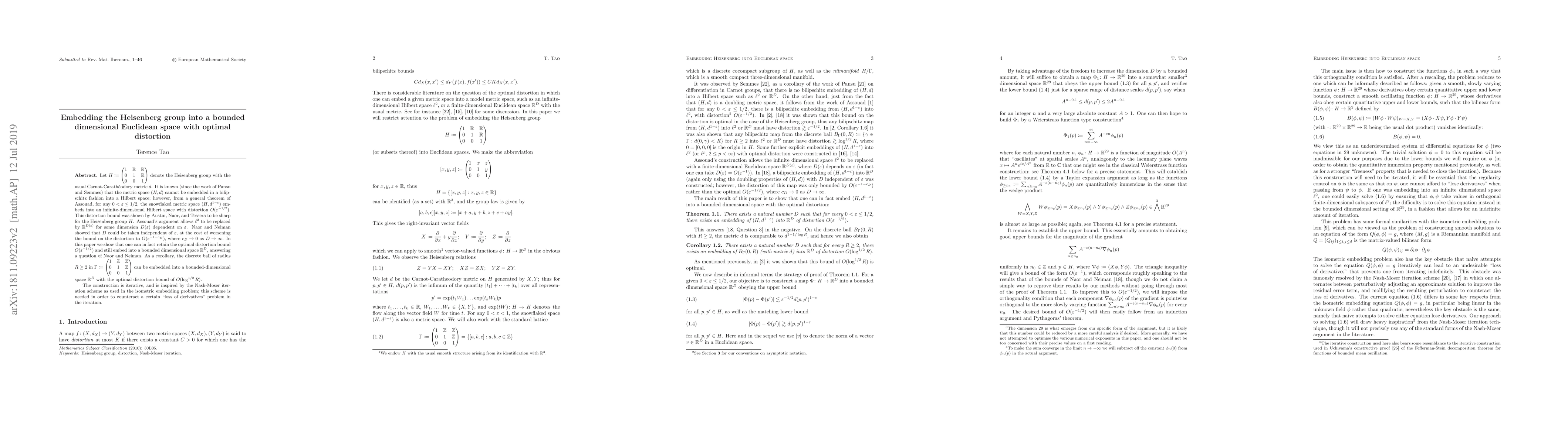 Researchers successfully embedded the Heisenberg group into a bounded-dimensional Euclidean space with optimal distortion $O(rac{1}{2})$, answering a question of Naor and Neiman.