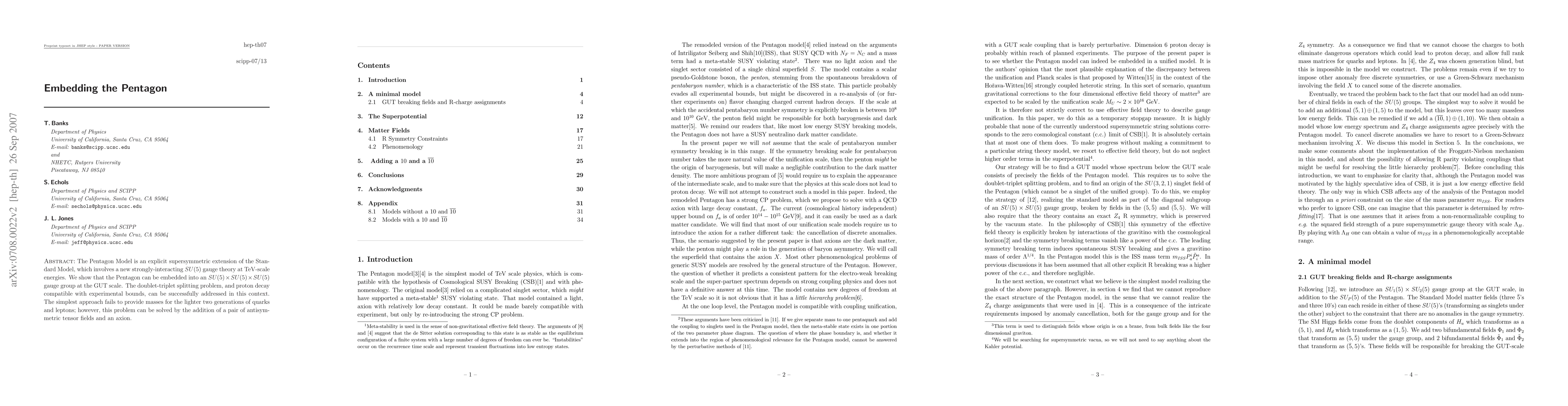 The Pentagon Model extends the Standard Model with a new SU(5) gauge theory at TeV-scale energies, embedding it into an SU(5) x SU(5) x SU(5) gauge group at the GUT scale to address the doublet-triplet splitting problem and proton decay. The generation of masses for the lighter quarks and leptons requires additional antisymmetric tensor fields and an axion.