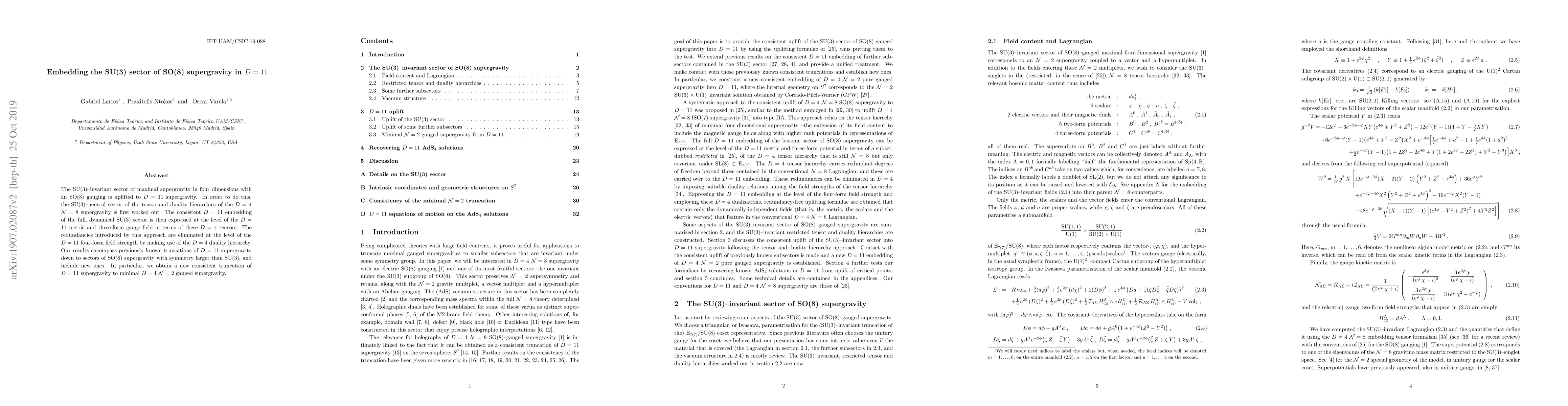 This paper details the embedding of the SU(3) sector from SO(8) supergravity in $D=11$ dimensions by uplifting the tensor and duality hierarchies from $D=4$ ${\cal N}=8$ supergravity. It introduces a new consistent truncation to minimal $D=4$ ${\cal N}=2$ gauged supergravity.