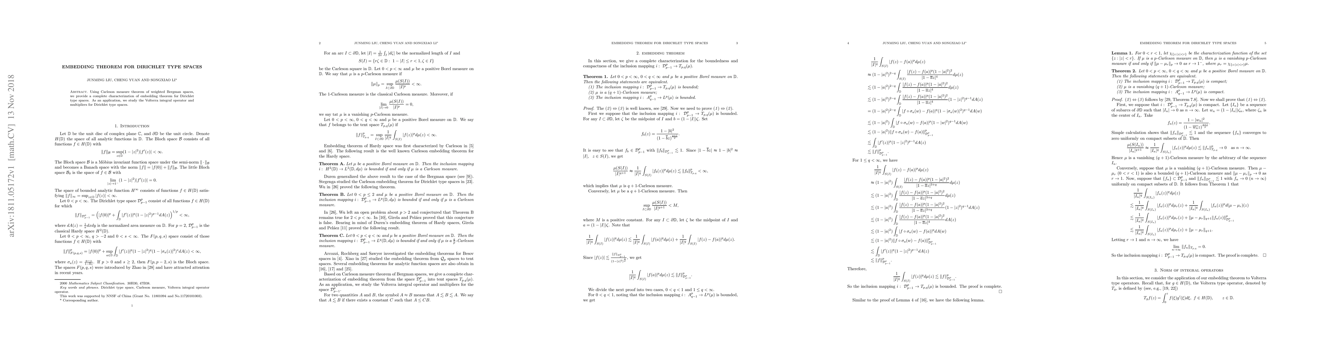 This paper characterizes embedding theorems for Dirichlet type spaces through the Carleson measure theorem for weighted Bergman spaces and applies these findings to study the Volterra integral operator and multipliers within Dirichlet type spaces.
