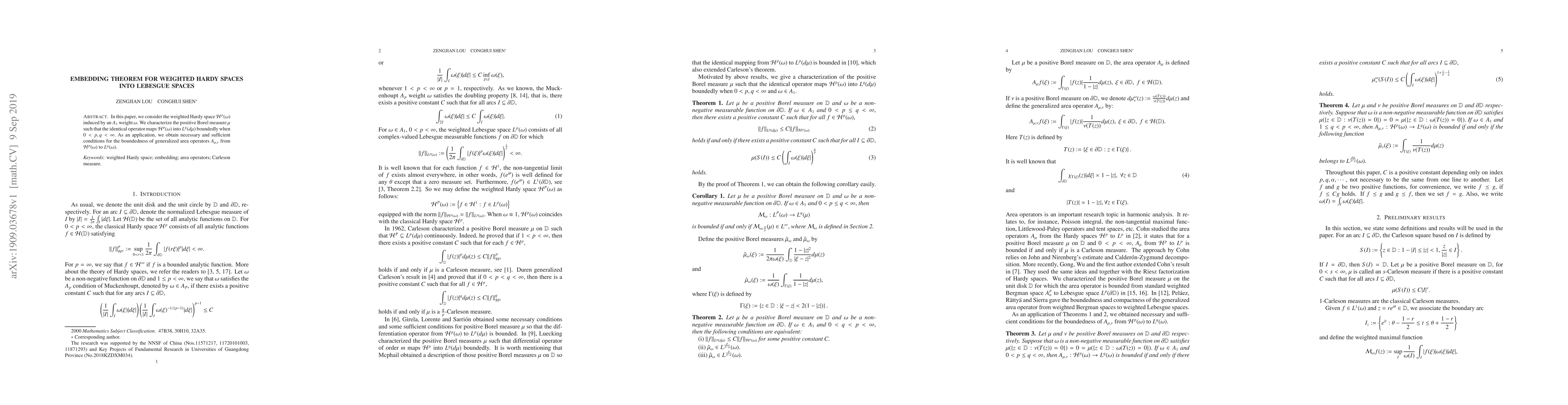 This paper characterizes conditions for a weighted Hardy space to map into a Lebesgue space boundedly, with applications to generalized area operators.