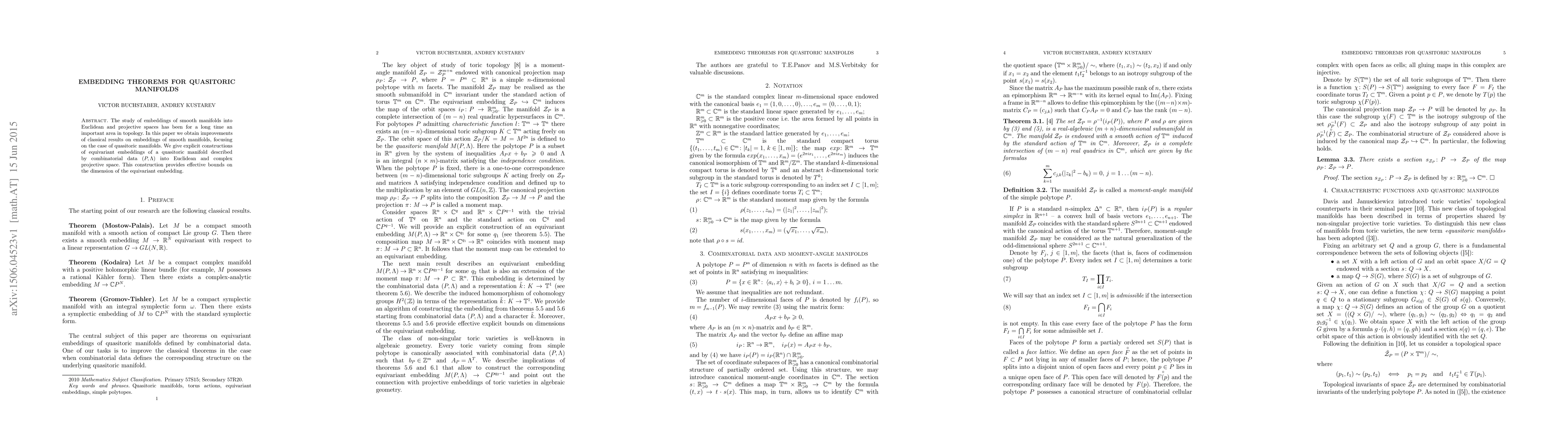 This paper improves classical embedding results for smooth manifolds, specifically quasitoric manifolds, by providing explicit constructions of their equivariant embeddings into Euclidean and complex projective spaces, along with effective dimension bounds.