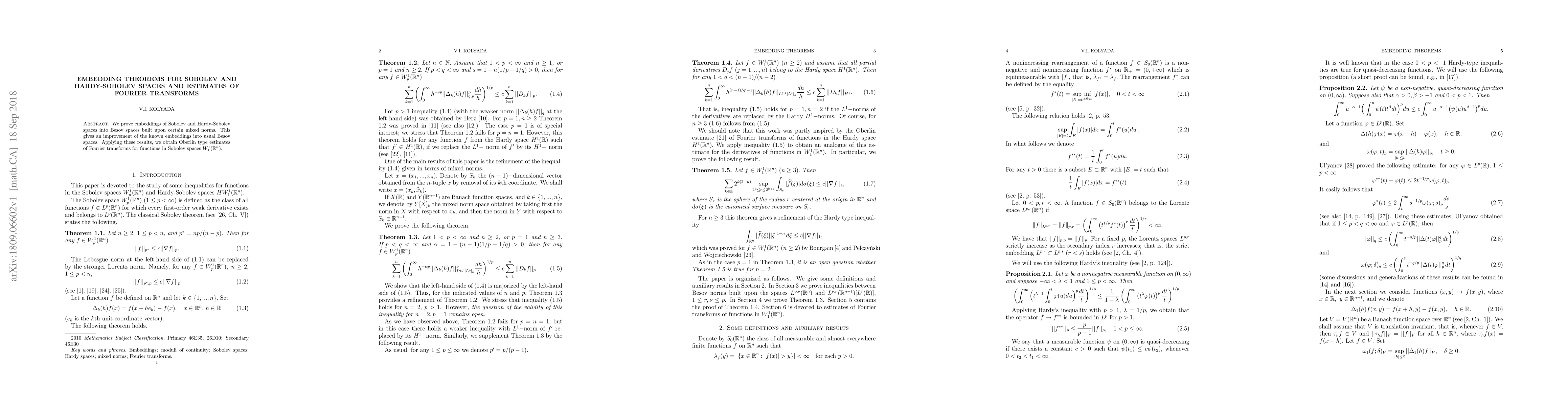 This paper proves improved embeddings of Sobolev and Hardy-Sobolev spaces into Besov spaces using mixed norms, and utilizes these results to derive Oberlin-type estimates for Fourier transforms of functions in $W_1^1(\mathbb{R}^n)$.