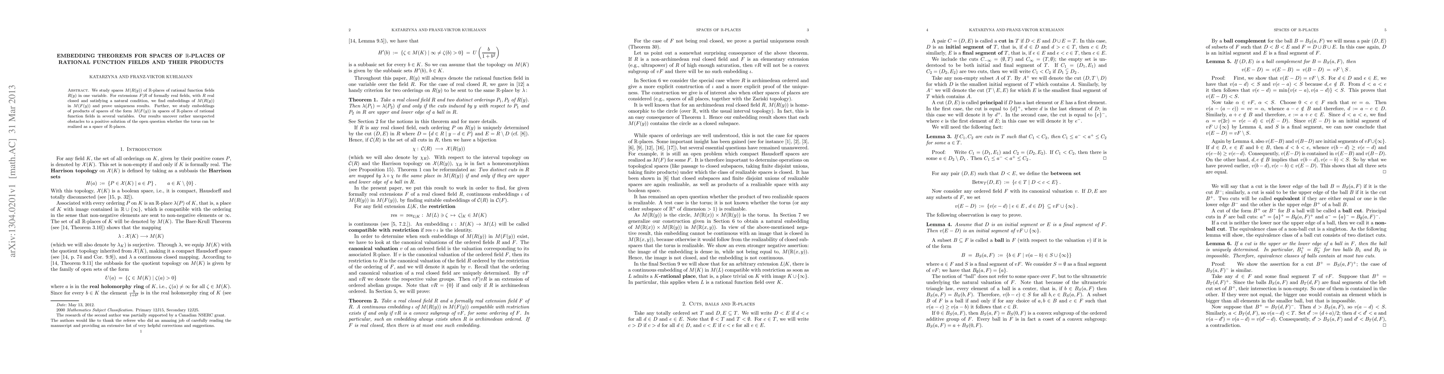 This paper explores embeddings of spaces of $\R$-places of rational function fields $R(y)$ into those of extensions $F|R$, proving uniqueness results. It also investigates embeddings of products of such spaces in multivariable rational function fields, revealing unexpected obstacles to realizing the torus as a space of $\R$-places.
