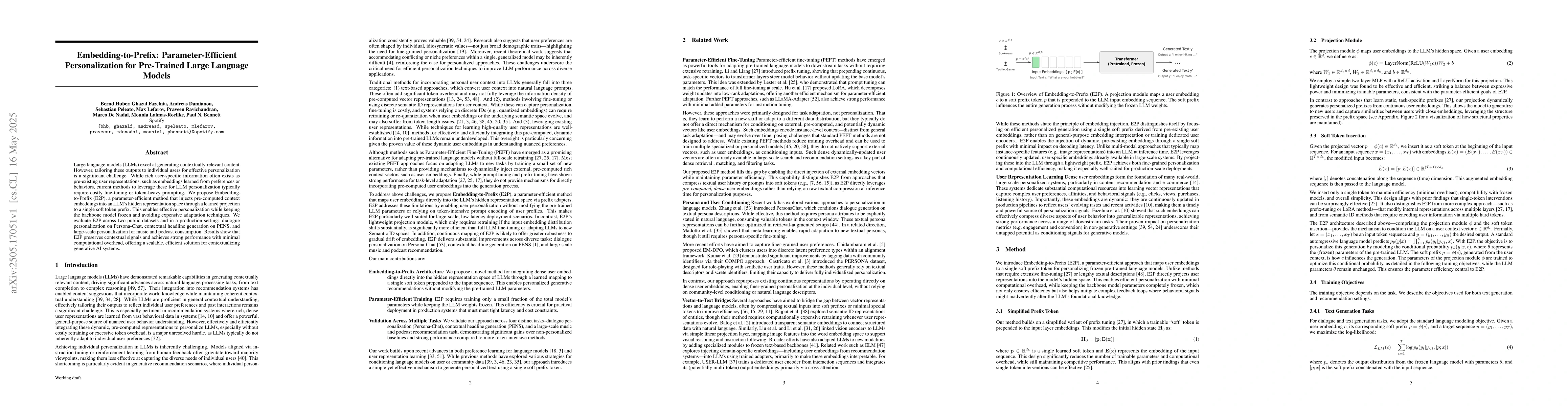 A new method called Embedding-to-Prefix (E2P) efficiently personalizes pre-trained large language models by injecting user-specific context embeddings into the model's hidden representation space.