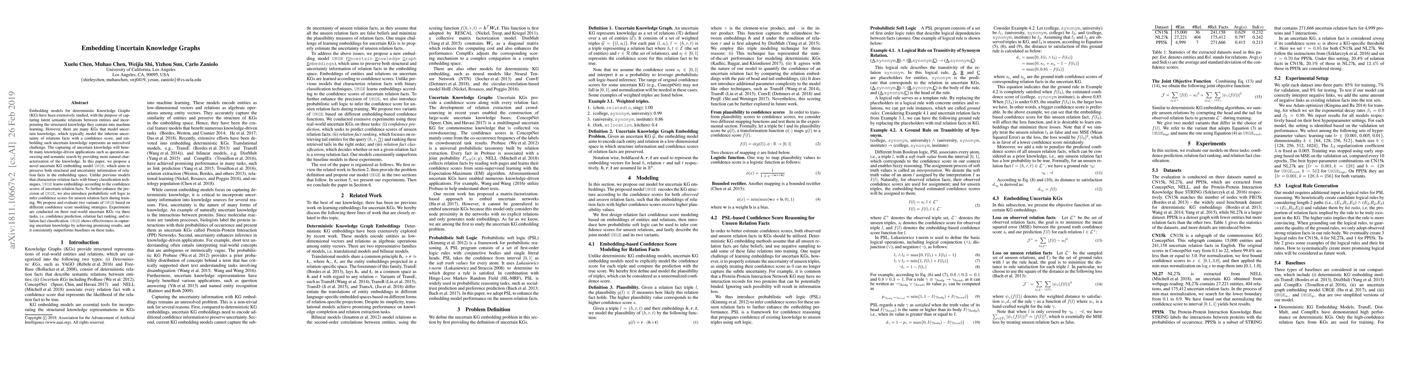 The paper proposes UKGE, a novel embedding model for uncertain Knowledge Graphs that preserves both structural and uncertainty information, learning embeddings based on relation fact confidence scores. It also introduces probabilistic soft logic to infer confidence scores for unseen facts, achieving better performance in confidence prediction, ranking, and classification tasks compared to baselines.