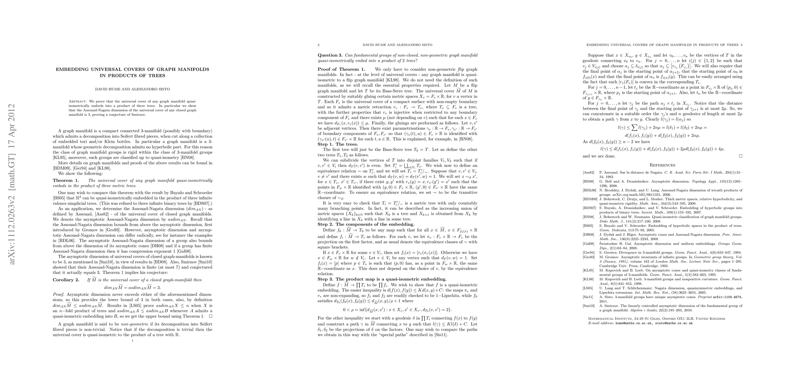 We prove that the universal cover of any graph manifold quasi-isometrically embeds into a product of three trees. In particular we show that the Assouad-Nagata dimension of the universal cover of any closed graph manifold is 3, proving a conjecture of Smirnov.