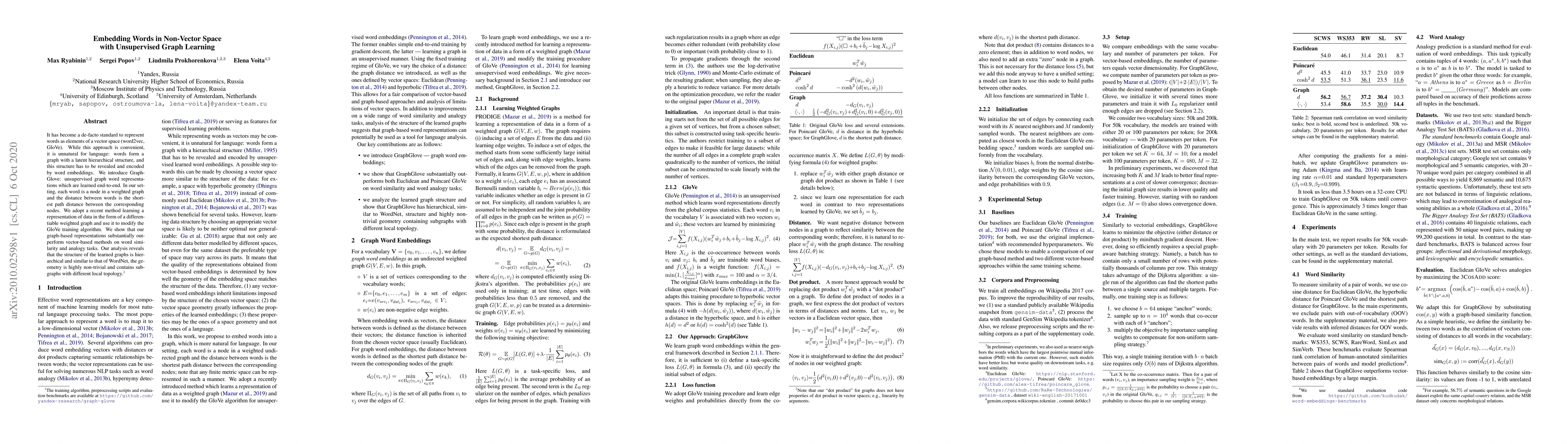 GraphGlove introduces unsupervised graph word representations that outperform traditional vector-based methods on word similarity and analogy tasks by encoding a latent hierarchical structure of words.