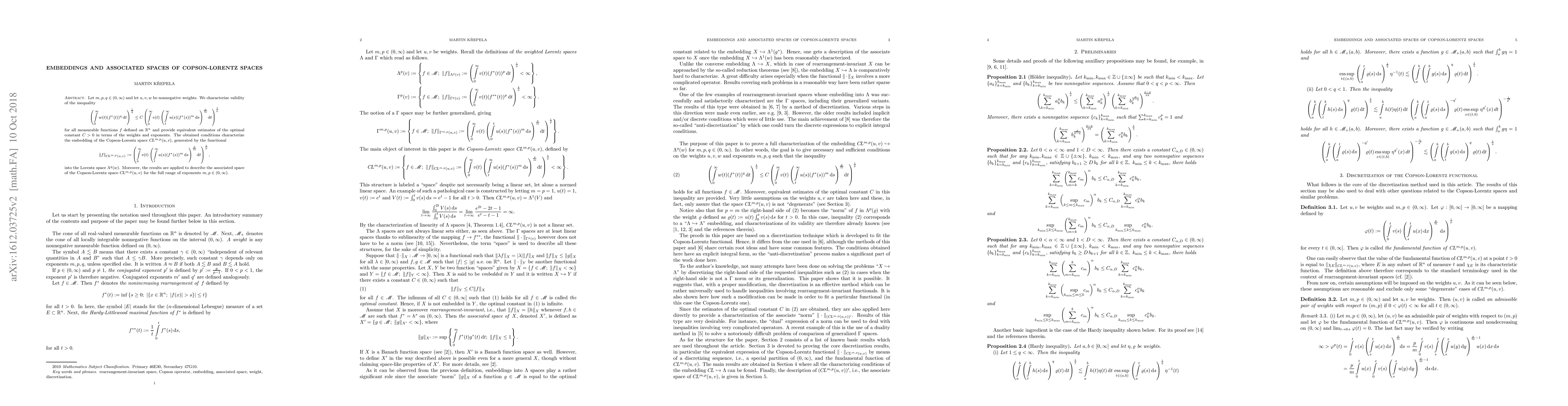 Let $m,p,q\in(0,\infty)$ and let $u,v,w$ be nonnegative weights. We characterize validity of the inequality \[ \left(\int_0^\infty w(t) (f^*(t))^q \, dt \right)^\frac 1q \le C \left(\int_0^\infty v(t) \left(\int_t^\infty u(s) (f^*(s))^m \,ds \right)^\frac pm \! dt \right)^\frac 1p \] for all measurable functions $f$ defined on $\mathbb{R}^n$ and provide equivalent estimates of the optimal constant $C>0$ in terms of the weights and exponents. The obtained conditions characterize the embedding of the Copson-Lorentz space $CL^{m,p}(u,v)$, generated by the functional \[ \|f\|_{{CL^{m,p}(u,v)}} := \left(\int_0^\infty v(t) \left(\int_t^\infty u(s) (f^*(s))^m \,ds \right)^\frac pm \! dt \right)^\frac 1p, \] into the Lorentz space $\Lambda^q(w)$. Moreover, the results are applied to describe the associated space of the Copson-Lorentz space ${CL^{m,p}(u,v)}$ for the full range of exponents $m,p\in(0,\infty)$.