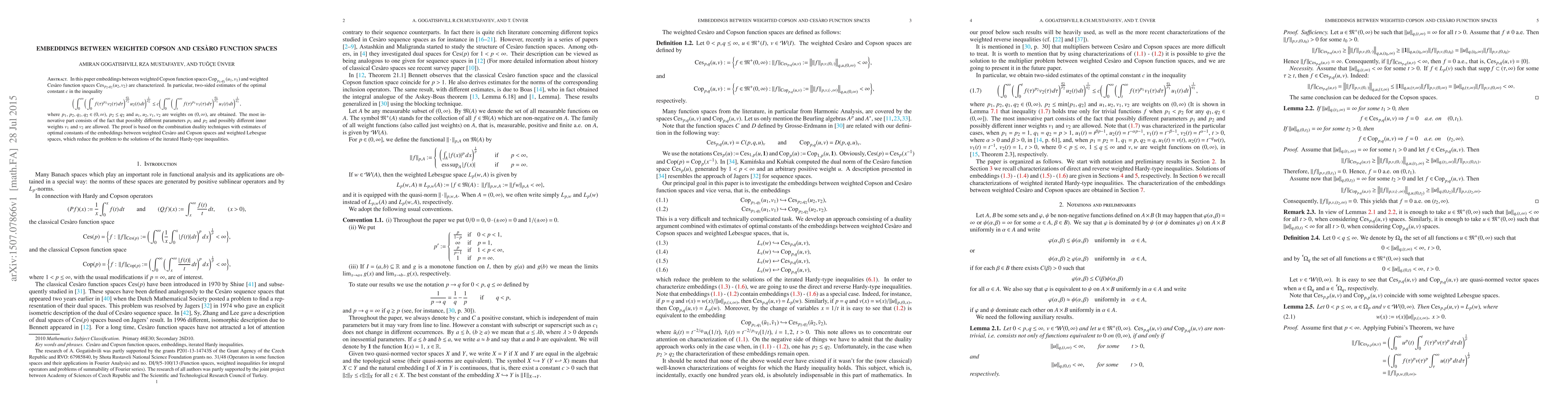 This paper characterizes embeddings between weighted Copson and Cesàro function spaces, providing two-sided estimates for the optimal constant in a specific inequality involving these spaces. The innovative aspect lies in allowing different parameters and weights, and the proof combines duality techniques with estimates from related function spaces.
