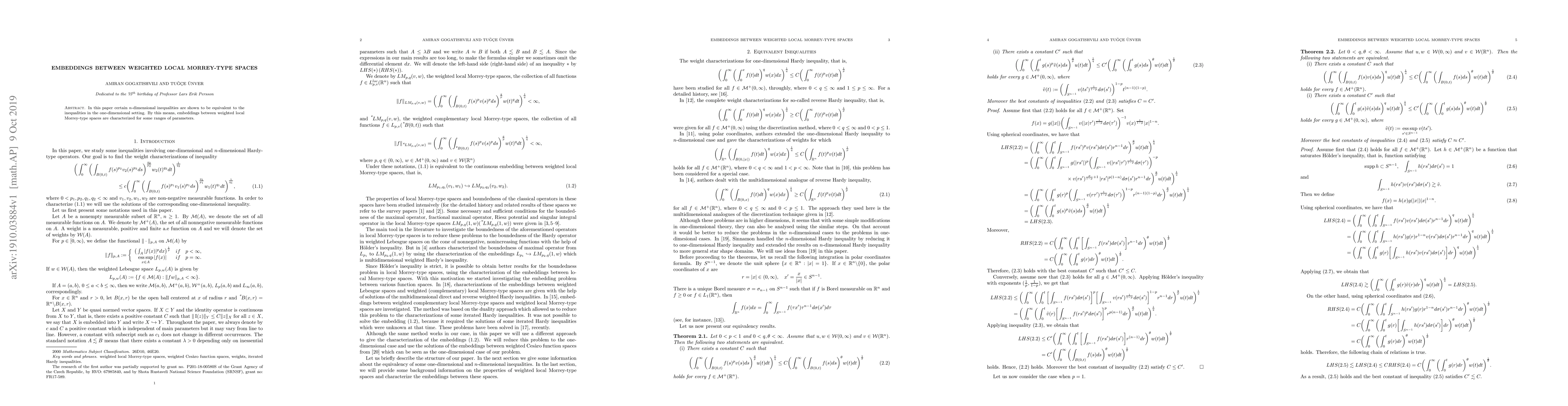 In this paper certain $n$-dimensional inequalities are shown to be equivalent to the inequalities in the one-dimensional setting. By this means, embeddings between weighted local Morrey-type spaces are characterized for some ranges of parameters.