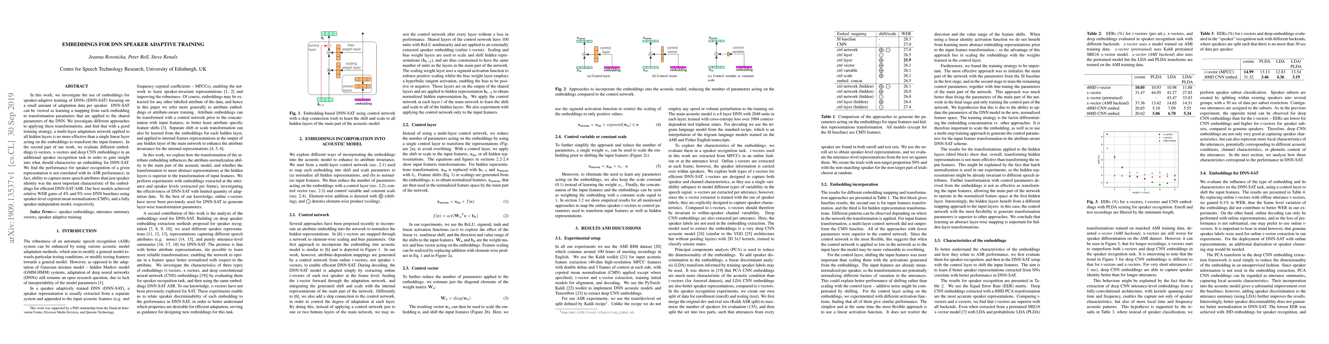 In this work, we investigate the use of embeddings for speaker-adaptive training of DNNs (DNN-SAT) focusing on a small amount of adaptation data per speaker. DNN-SAT can be viewed as learning a mapping from each embedding to transformation parameters that are applied to the shared parameters of the DNN. We investigate different approaches to applying these transformations, and find that with a good training strategy, a multi-layer adaptation network applied to all hidden layers is no more effective than a single linear layer acting on the embeddings to transform the input features. In the second part of our work, we evaluate different embeddings (i-vectors, x-vectors and deep CNN embeddings) in an additional speaker recognition task in order to gain insight into what should characterize an embedding for DNN-SAT. We find the performance for speaker recognition of a given representation is not correlated with its ASR performance; in fact, ability to capture more speech attributes than just speaker identity was the most important characteristic of the embeddings for efficient DNN-SAT ASR. Our best models achieved relative WER gains of 4% and 9% over DNN baselines using speaker-level cepstral mean normalisation (CMN), and a fully speaker-independent model, respectively.