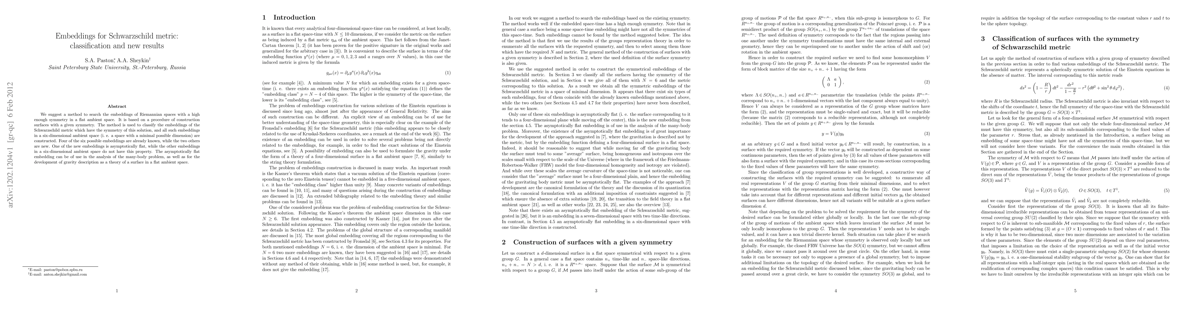We suggest a method to search the embeddings of Riemannian spaces with a high enough symmetry in a flat ambient space. It is based on a procedure of construction surfaces with a given symmetry. The method is used to classify the embeddings of the Schwarzschild metric which have the symmetry of this solution, and all such embeddings in a six-dimensional ambient space (i.e. a space with a minimal possible dimension) are constructed. Four of the six possible embeddings are already known, while the two others are new. One of the new embeddings is asymptotically flat, while the other embeddings in a six-dimensional ambient space do not have this property. The asymptotically flat embedding can be of use in the analysis of the many-body problem, as well as for the development of gravity description as a theory of a surface in a flat ambient space.