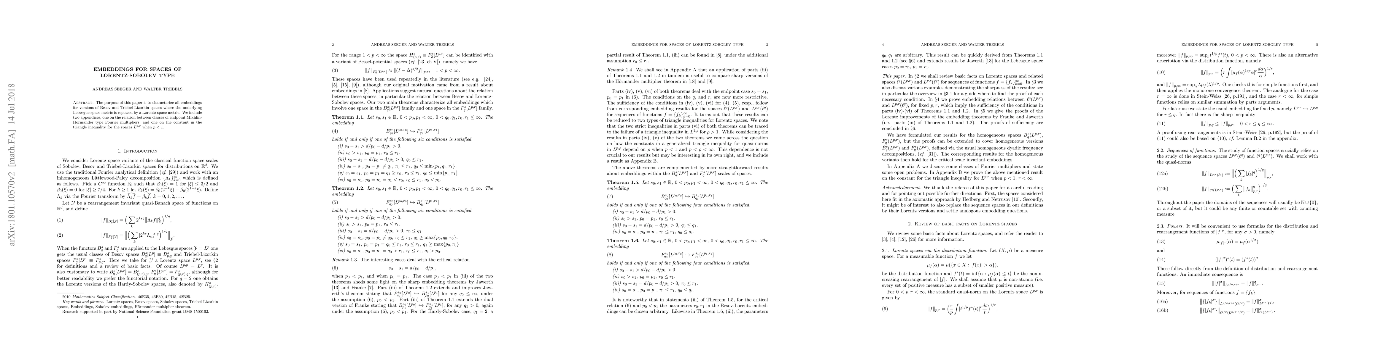 The paper presents a thorough examination of embeddings for Besov and Triebel-Lizorkin spaces with Lorentz space metrics, including detailed proofs and analysis of endpoint Mikhlin-Hörmander multipliers and constants in the triangle inequality for L^p,r spaces when p < 1.