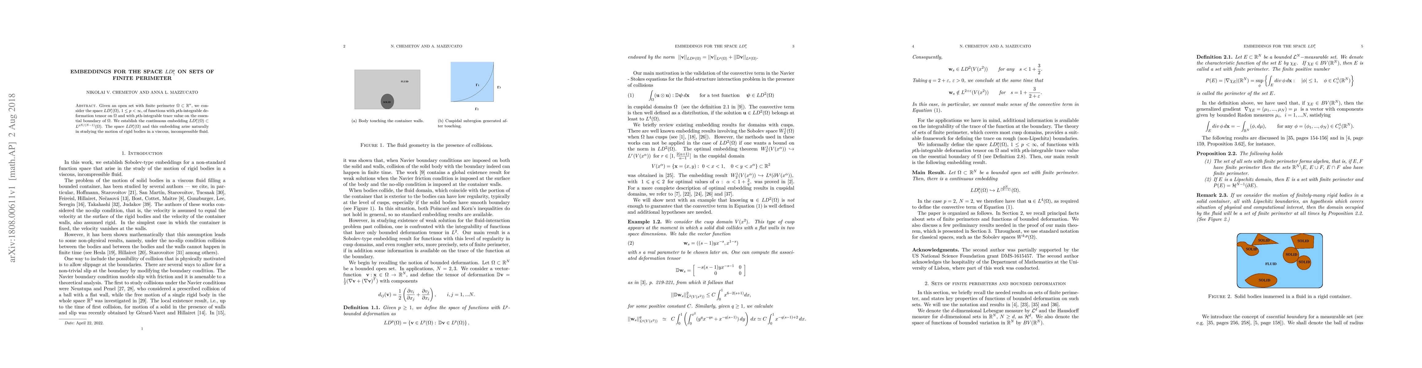Given an open set with finite perimeter $\Omega\subset \mathbb{R}^n$, we consider the space $LD_\gamma^{p}(\Omega)$, $1\leq p<\infty$, of functions with $p$th-integrable deformation tensor on $\Omega$ and with $p$ th-integrable trace value on the essential boundary of $\Omega$. We establish the continuous embedding $LD_\gamma^{p}(\Omega)\subset L^{pN/(N-1)}(\Omega)$. The space $LD_\gamma^{p}(\Omega)$ and this embedding arise naturally in studying the motion of rigid bodies in a viscous, incompressible fluid.