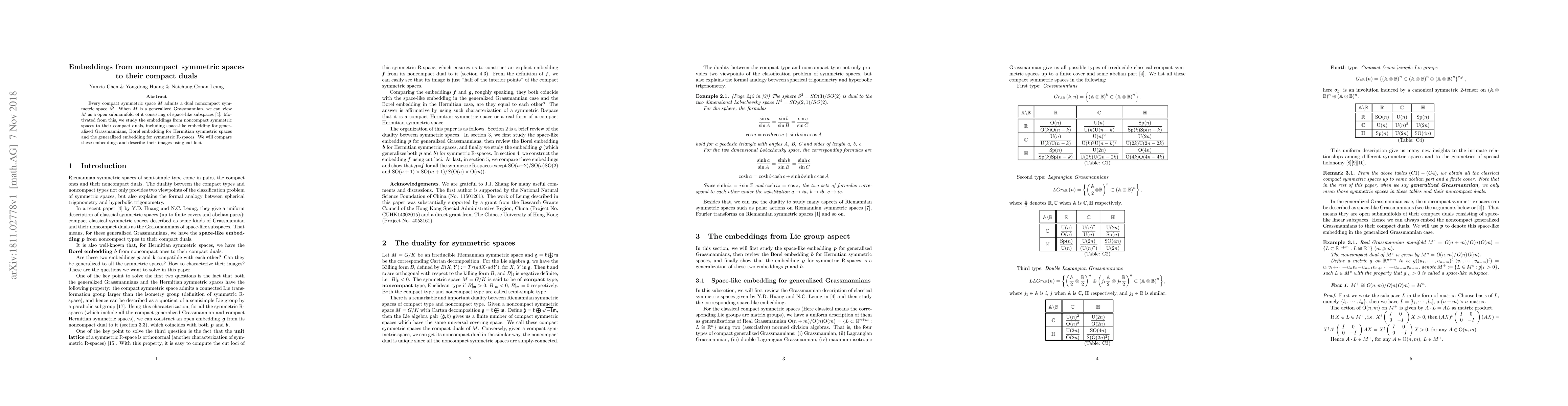 Every compact symmetric space $M$ admits a dual noncompact symmetric space $\check{M}$. When $M$ is a generalized Grassmannian, we can view $\check{M}$ as a open submanifold of it consisting of space-like subspaces \cite{HL}. Motivated from this, we study the embeddings from noncompact symmetric spaces to their compact duals, including space-like embedding for generalized Grassmannians, Borel embedding for Hermitian symmetric spaces and the generalized embedding for symmetric R-spaces. We will compare these embeddings and describe their images using cut loci.