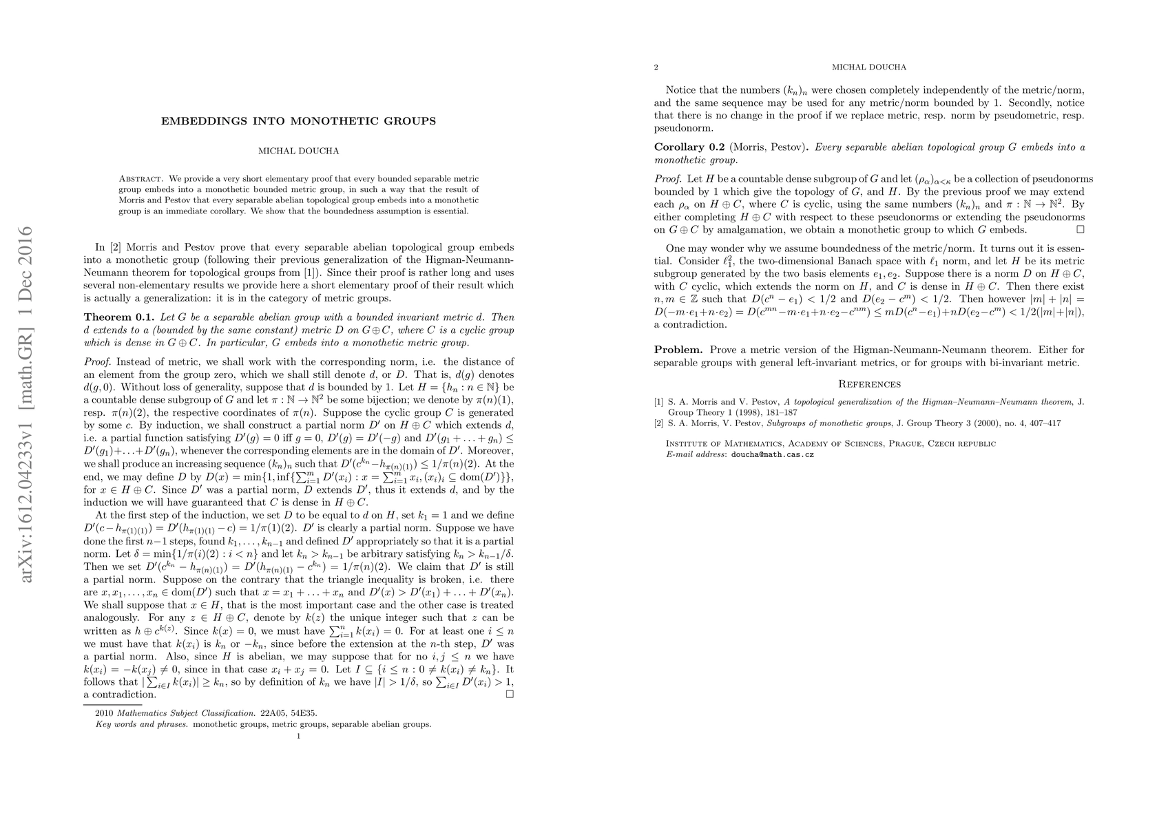 We provide a very short elementary proof that every bounded separable metric group embeds into a monothetic bounded metric group, in such a way that the result of Morris and Pestov that every separable abelian topological group embeds into a monothetic group is an immediate corollary. We show that the boundedness assumption is essential.
