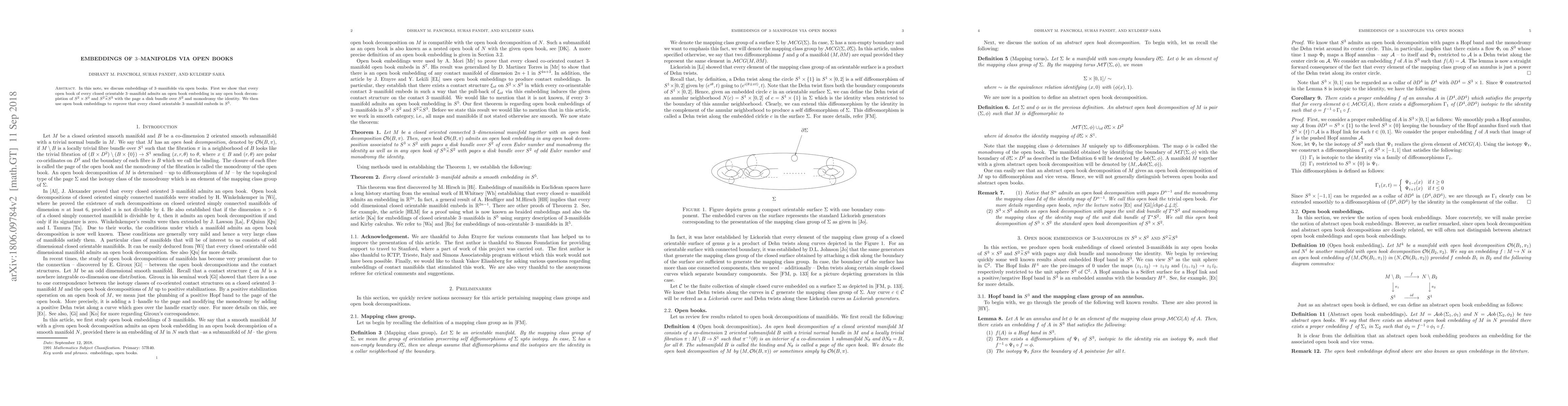In this note, we discuss embeddings of $3$--manifolds via open books. First we show that every open book of every closed orientable $3$--manifold admits an open book embedding in any open book decompistion of $S^2 \times S^3$ and $S^2 \widetilde{\times} S^3$ with the page a disk bundle over $S^2$ and monodromy the identity. We then use open book embeddings to reprove that every closed orientable $3$--manifold embeds in $S^5.$