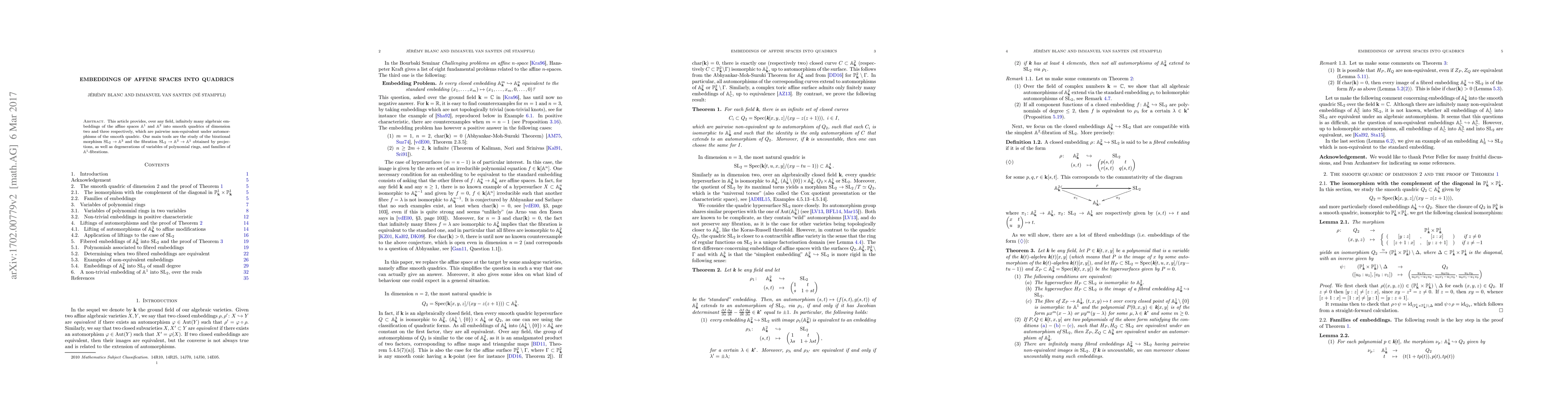 This article provides, over any field, infinitely many algebraic embeddings of the affine spaces $\mathbb{A}^1$ and $\mathbb{A}^2$ into smooth quadrics of dimension two and three respectively, which are pairwise non-equivalent under automorphisms of the smooth quadric. Our main tools are the study of the birational morphism $\mathrm{SL}_2 \to \mathbb{A}^3$ and the fibration $\mathrm{SL}_2 \to \mathbb{A}^3 \to \mathbb{A}^1$ obtained by projections, as well as degenerations of variables of polynomial rings, and families of $\mathbb{A}^1$-fibrations.