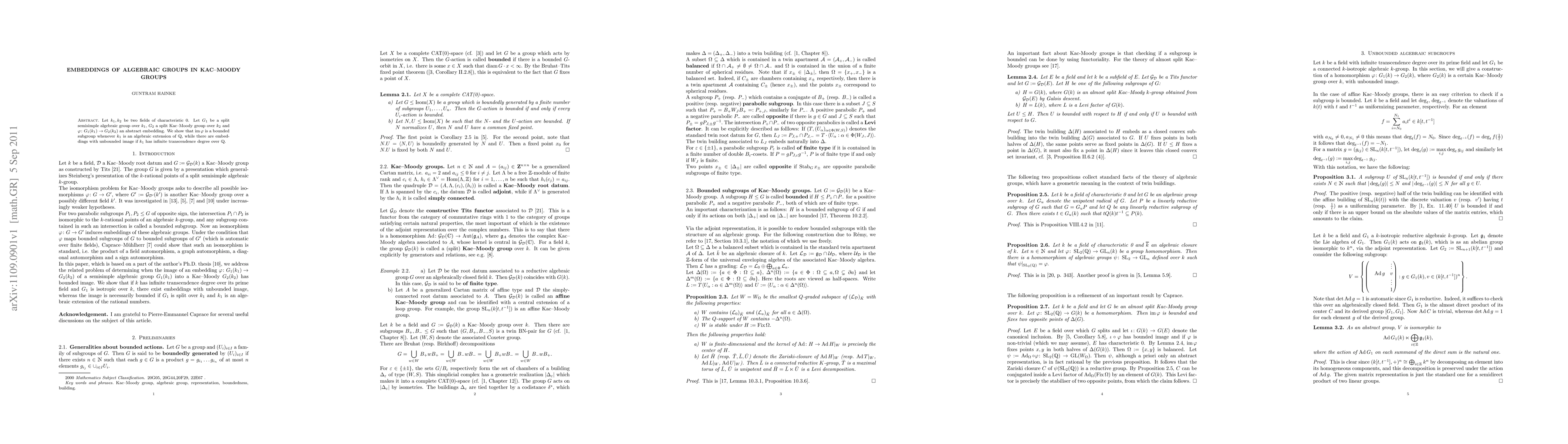 Let $k_1,k_2$ be two fields of characteristic 0. Let $G_1$ be a split semisimple algebraic group over $k_1$, $G_2$ a split Kac--Moody group over $k_2$ and $\phi\colon G_1(k_1)\to G_2(k_2)$ an abstract embedding. We show that $\im \phi$ is a bounded subgroup whenever $k_1$ is an algebraic extension of the rational numbers, while there are embeddings with unbounded image if $k_1$ has infinite transcendence degree over the rational numbers.