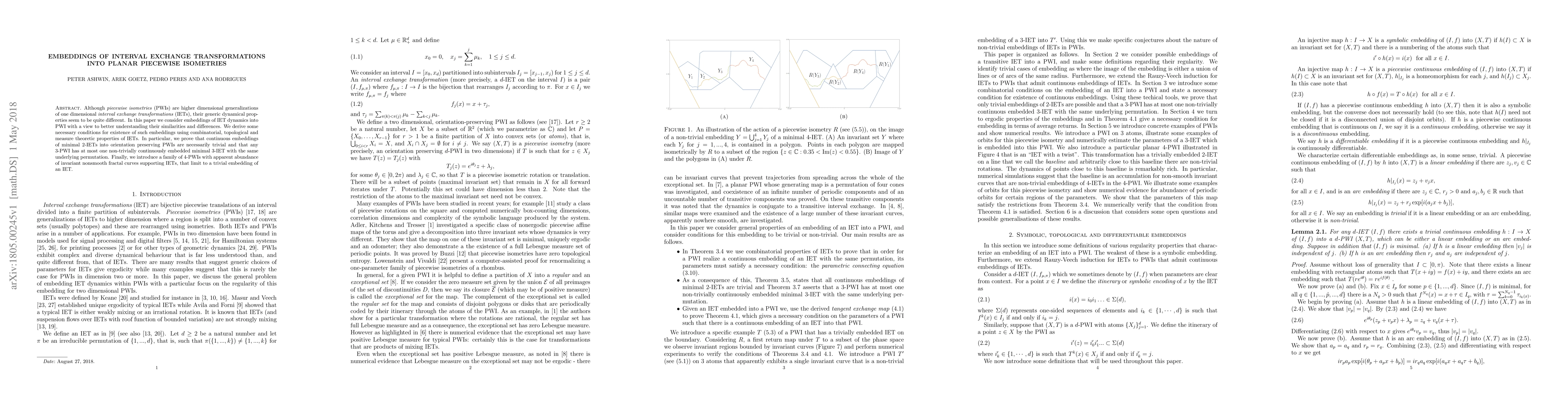 This paper explores embeddings of interval exchange transformations (IETs) into planar piecewise isometries (PWIs) to understand their dynamical properties. It finds that continuous embeddings of minimal 2-IETs into orientation-preserving PWIs are trivial, and that any 3-PWI can host at most one non-trivially embedded minimal 3-IET. It also introduces 4-PWIs that support IETs with abundant invariant fractal curves.
