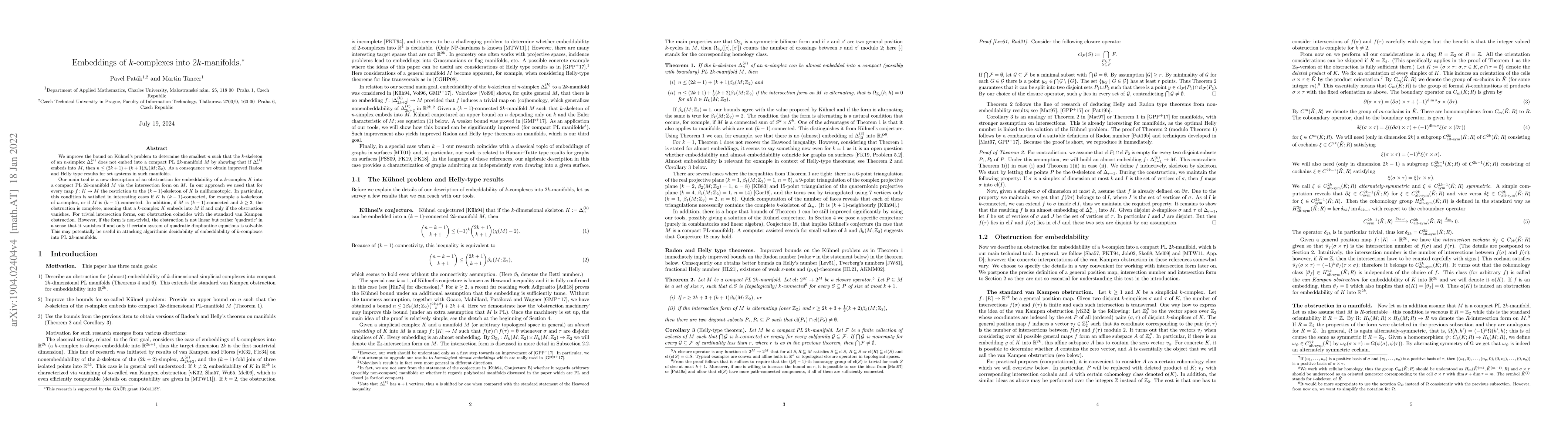 We improve the bound on K\"uhnel's problem to determine the smallest $n$ such that the $k$-skeleton of an $n$-simplex $\Delta_n^{(k)}$ does not embed into a compact PL $2k$-manifold $M$ by showing that if $\Delta_n^{(k)}$ embeds into $M$, then $n\leq (2k+1)+(k+1)\beta_k(M;\mathbb Z_2)$. As a consequence we obtain improved Radon and Helly type results for set systems in such manifolds. Our main tool is a new description of an obstruction for embeddability of a $k$-complex $K$ into a compact PL $2k$-manifold $M$ via the intersection form on $M$. In our approach we need that for every map $f\colon K\to M$ the restriction to the $(k-1)$-skeleton of $K$ is nullhomotopic. In particular, this condition is satisfied in interesting cases if $K$ is $(k-1)$-connected, for example a $k$-skeleton of $n$-simplex, or if $M$ is $(k-1)$-connected. In addition, if $M$ is $(k-1)$-connected and $k\geq 3$, the obstruction is complete, meaning that a $k$-complex $K$ embeds into $M$ if and only if the obstruction vanishes. For trivial intersection forms, our obstruction coincides with the standard van Kampen obstruction. However, if the form is non-trivial, the obstruction is not linear but rather 'quadratic' in a sense that it vanishes if and only if certain system of quadratic diophantine equations is solvable. This may potentially be useful in attacking algorithmic decidability of embeddability of $k$-complexes into PL $2k$-manifolds.