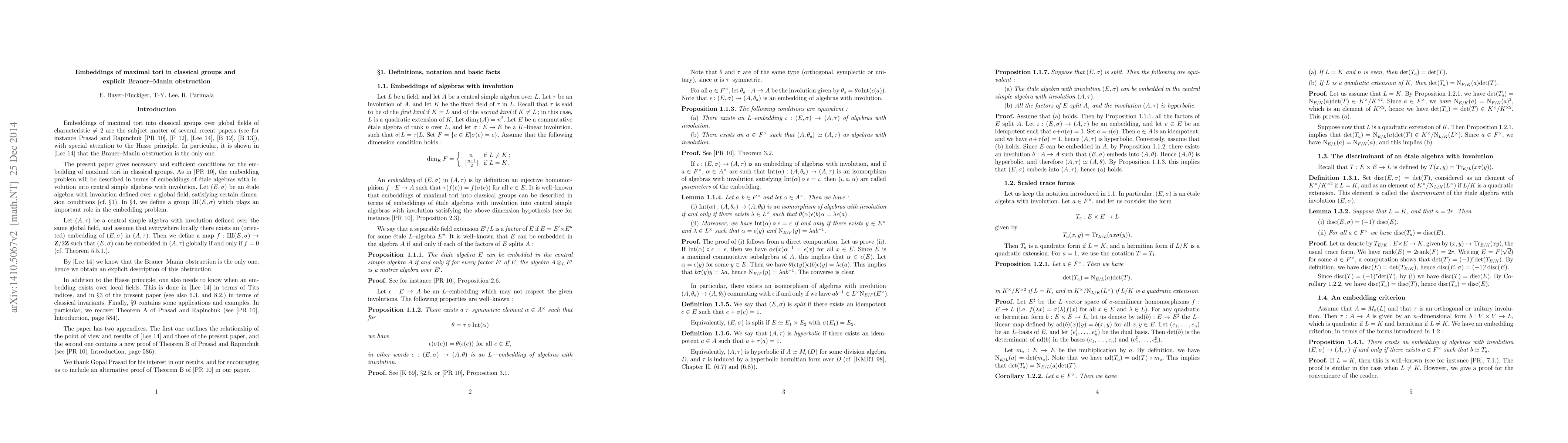 Embeddings of maximal tori into classical groups over global fields of characteristic not 2 are the subject matter of several recent papers, with special attention to the Hasse principle. The present paper gives necessary and sufficient conditions for this embedding problem, and in particular for the Hasse principle to hold. Using work of Borovoi, this is interpreted as a Brauer-Manin type obstruction.
